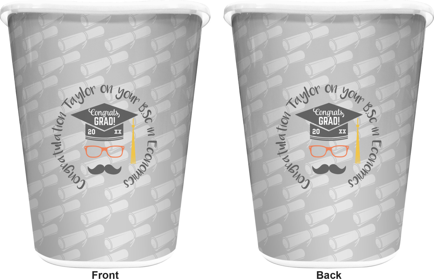 You can choose to purchase these decorative wastebaskets in either a white or a black color that will show on the base and the upper rim. Your customization is printed on a high-gloss, fine-quality vinyl adhesive, and you can choose to either have this adhesive applied to one side only or to both sides. As such, this plastic wastebasket can be single-sided or double-sided, depending on your creative vision. Your customization is printed using durable inks, making the design waterproof and resistant to fading over time.