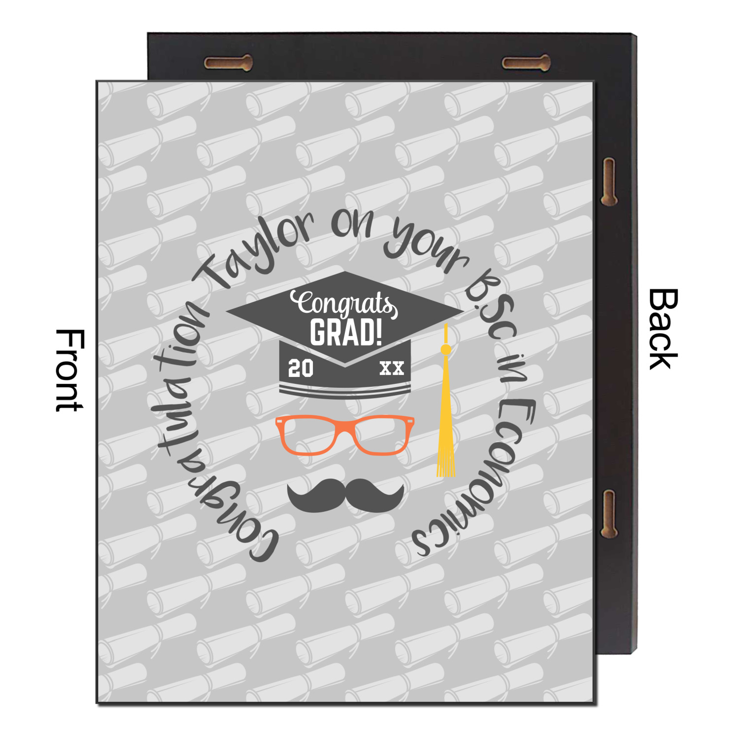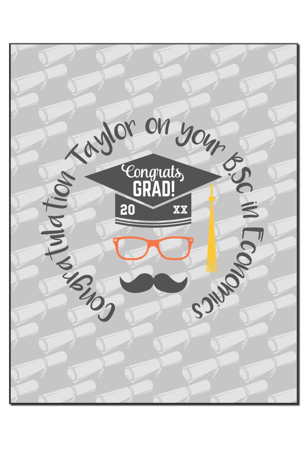 This whimsical and fun design makes the perfect graduation gift. We chose a tone on tone background with graduation scrolls and chose a light grey color. We chose graphic with circular text for our personalization style; change the text to suit your graduate. Customize the colors in the hipster graphic including the glasses, tassel and mustache color. We have other graduate backgrounds as well as graduate graphic in our system. So go ahead and change things to suit your graduate.