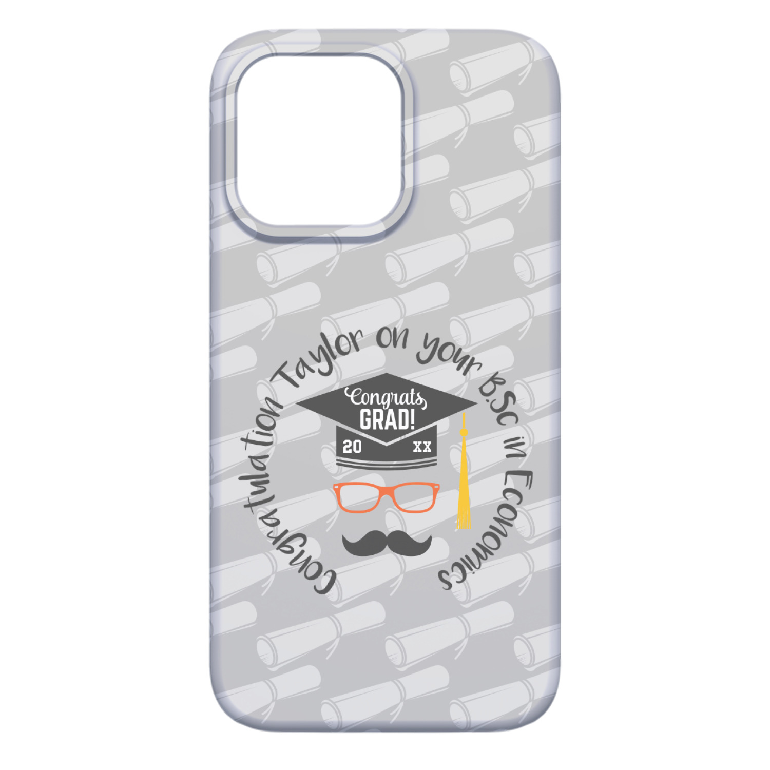 This whimsical and fun design makes the perfect graduation gift. We chose a tone on tone background with graduation scrolls and chose a light grey color. We chose graphic with circular text for our personalization style; change the text to suit your graduate. Customize the colors in the hipster graphic including the glasses, tassel and mustache color. We have other graduate backgrounds as well as graduate graphic in our system. So go ahead and change things to suit your graduate.