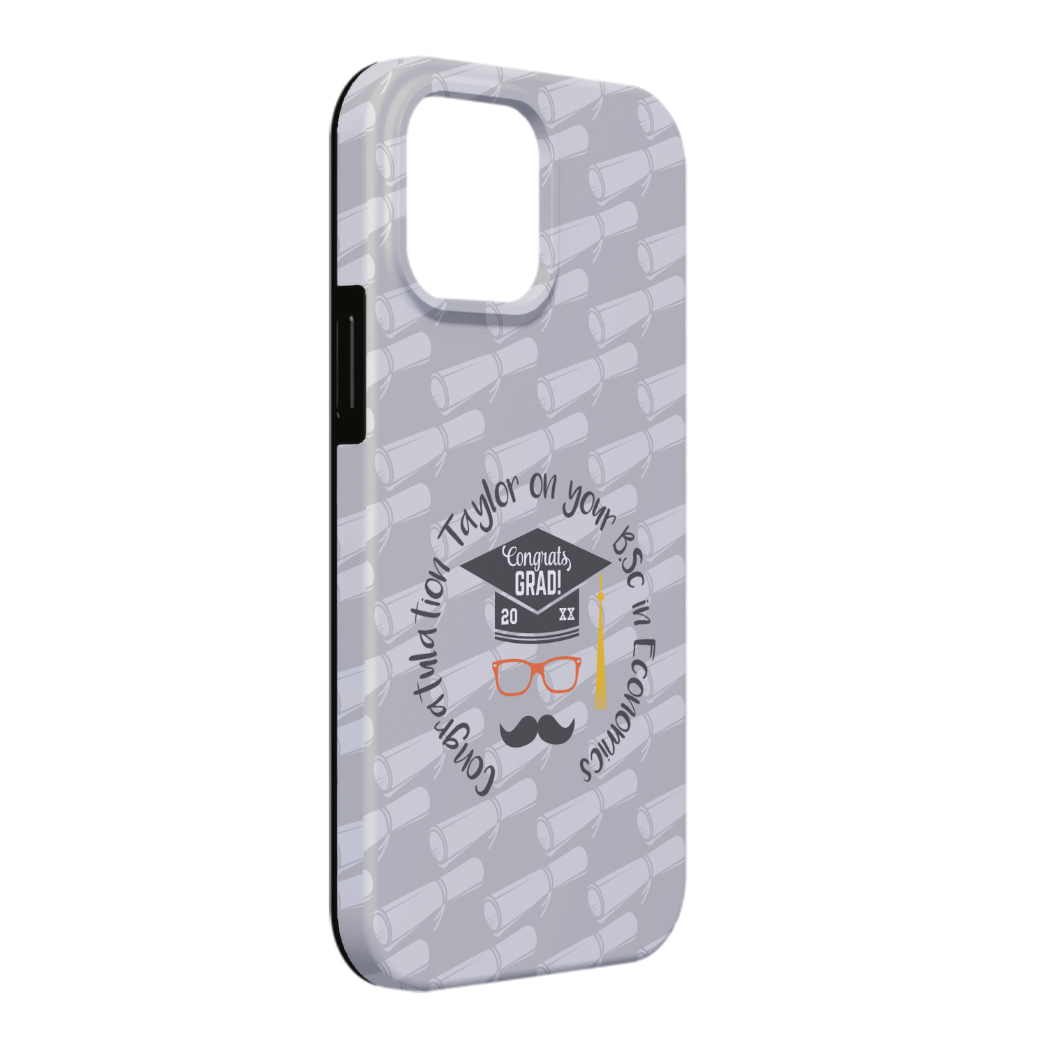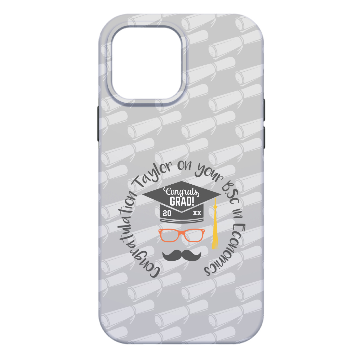 This whimsical and fun design makes the perfect graduation gift. We chose a tone on tone background with graduation scrolls and chose a light grey color. We chose graphic with circular text for our personalization style; change the text to suit your graduate. Customize the colors in the hipster graphic including the glasses, tassel and mustache color. We have other graduate backgrounds as well as graduate graphic in our system. So go ahead and change things to suit your graduate.