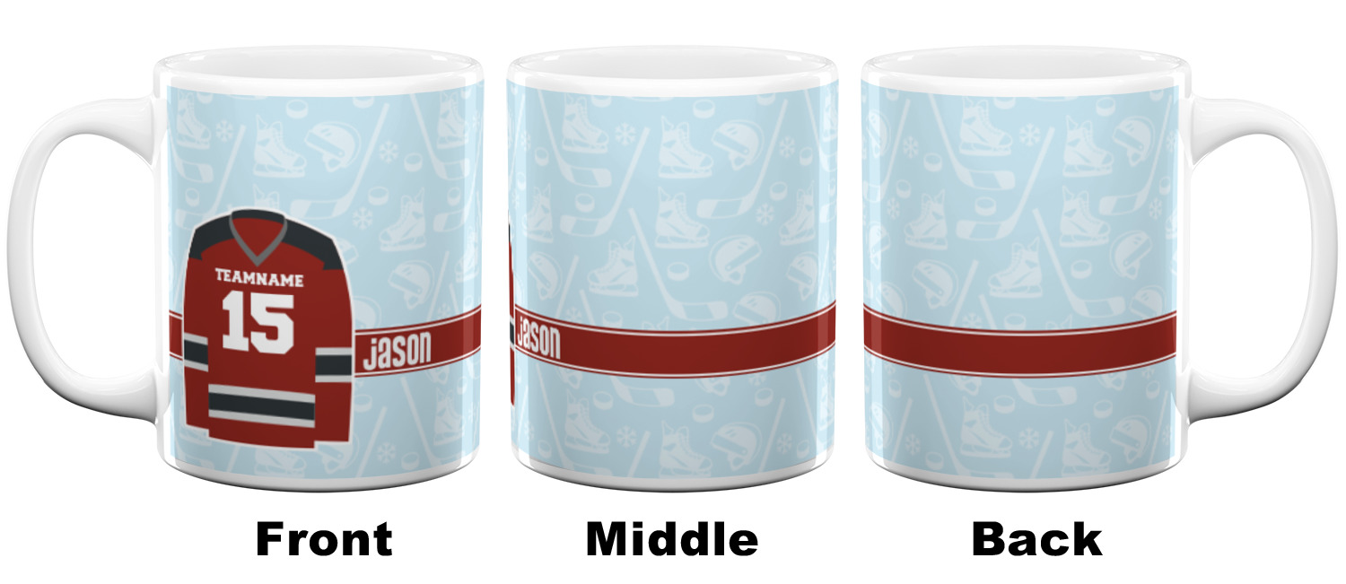 This design features a white background, reminiscent of ice, with hockey pucks repeating on it. The main design has a red hockey jersey in the foreground that can be customized with your favorite team's colors. This design perfect for any die-hard hockey fans!