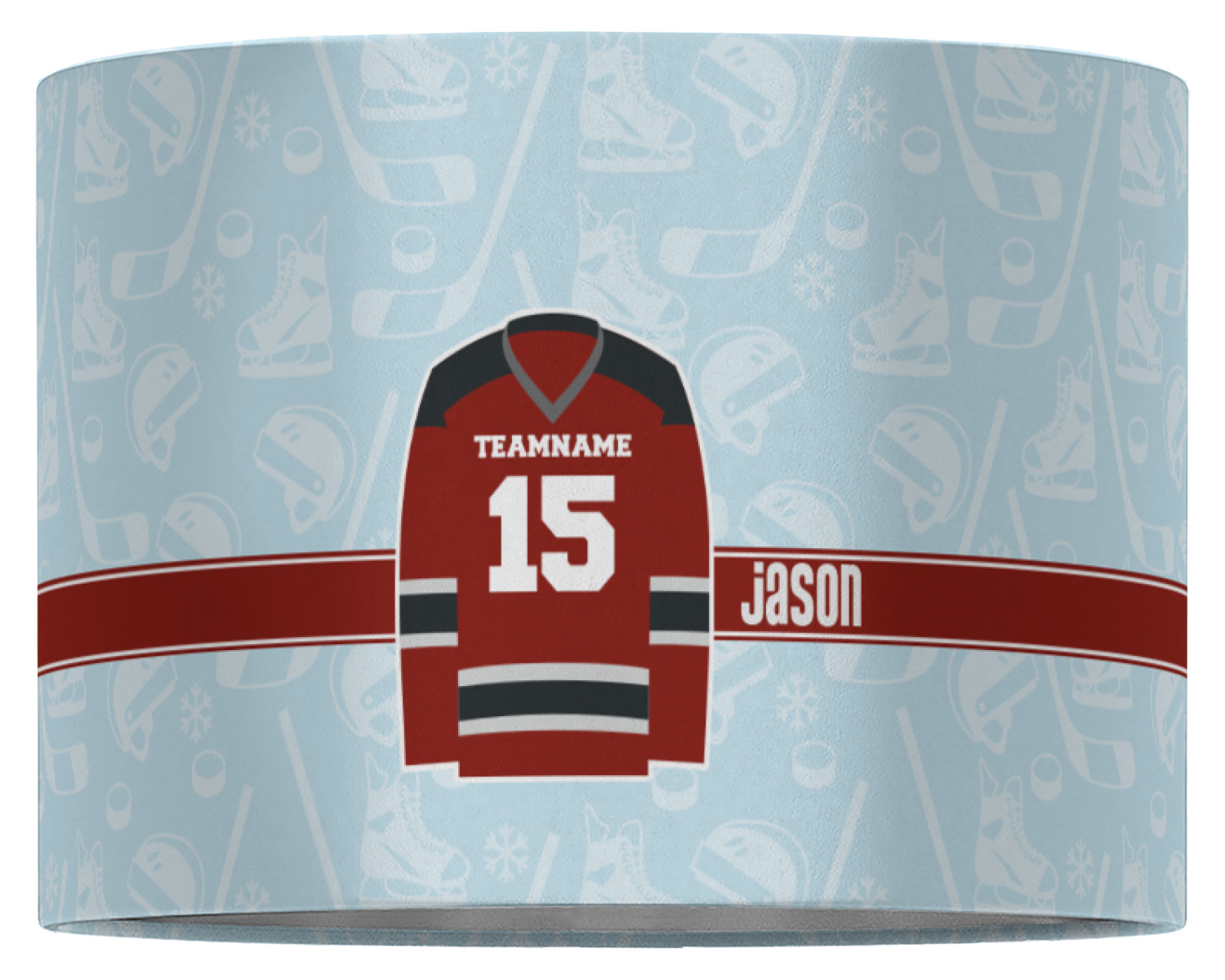 This design features a white background, reminiscent of ice, with hockey pucks repeating on it. The main design has a red hockey jersey in the foreground that can be customized with your favorite team's colors. This design perfect for any die-hard hockey fans!