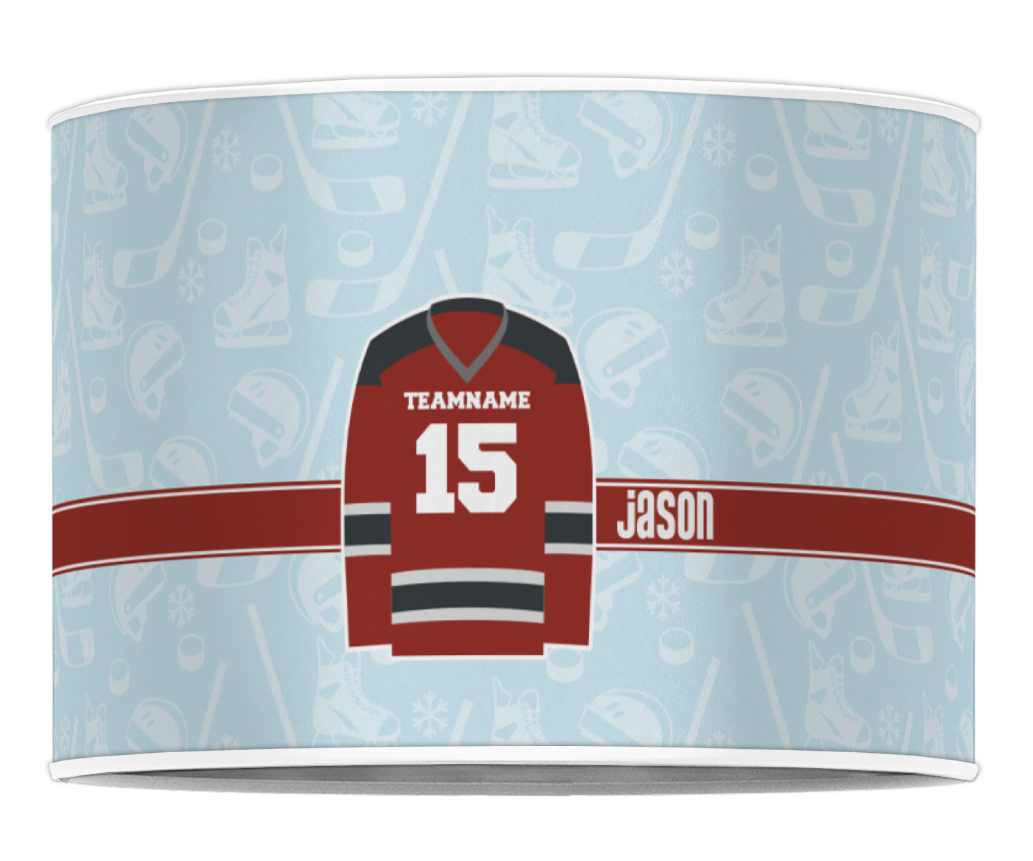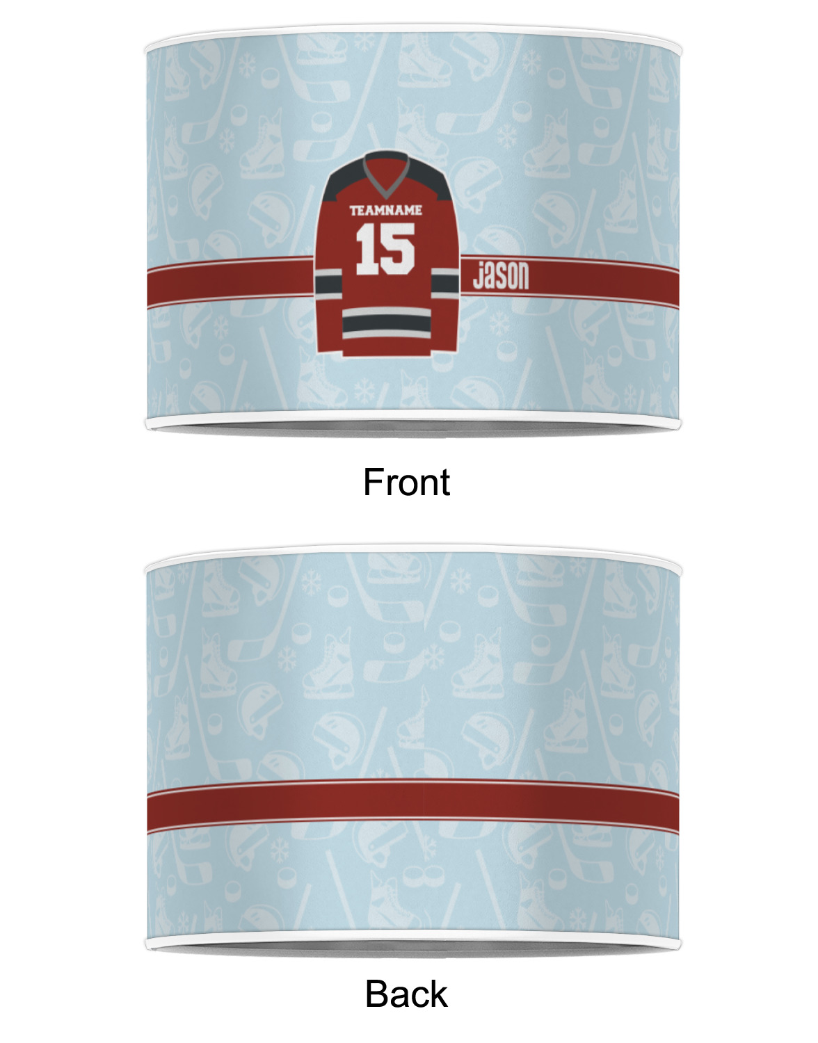 This design features a white background, reminiscent of ice, with hockey pucks repeating on it. The main design has a red hockey jersey in the foreground that can be customized with your favorite team's colors. This design perfect for any die-hard hockey fans!