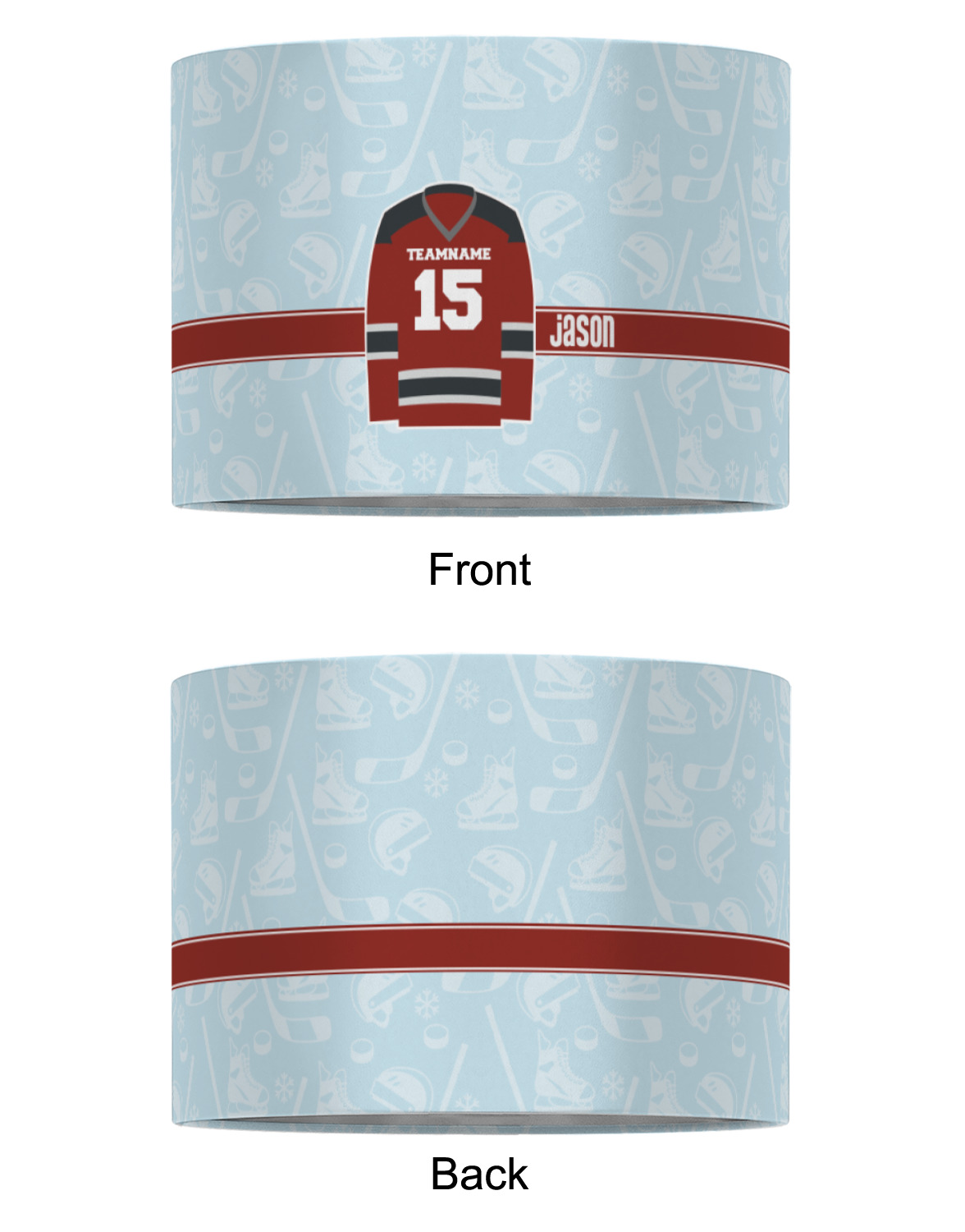This design features a white background, reminiscent of ice, with hockey pucks repeating on it. The main design has a red hockey jersey in the foreground that can be customized with your favorite team's colors. This design perfect for any die-hard hockey fans!