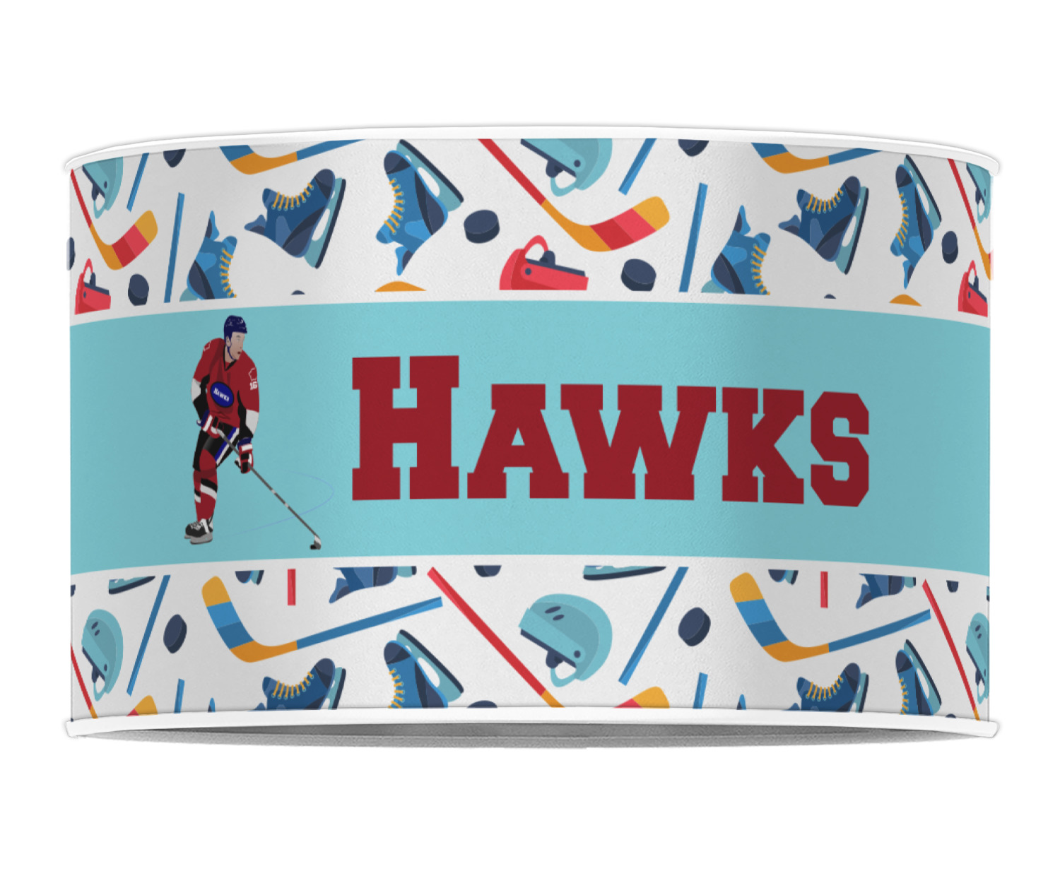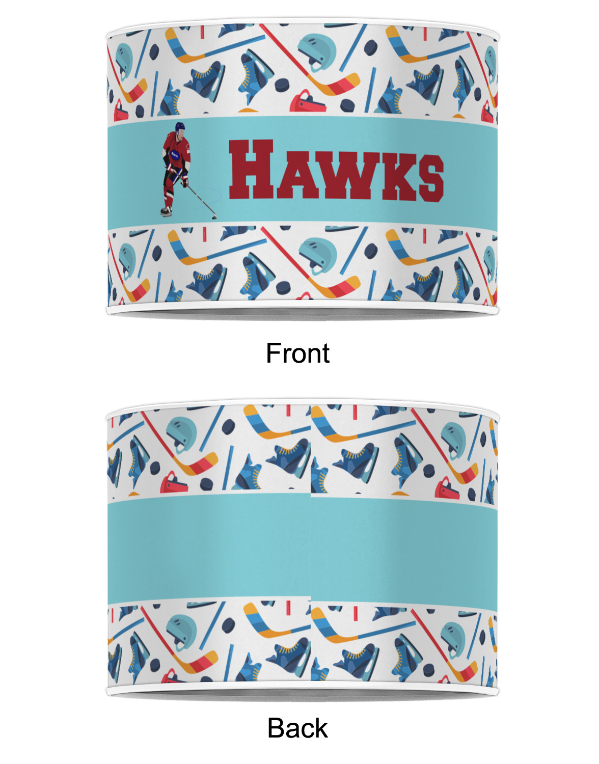 The main design has a fun background with illustrated hockey equipment including a helmet, hockey puck, skate, and hockey sticks. Going through the middle of the design is a solid strip of light teal with a graphic of a hockey player alongside a team name. The coordinating design uses this solid teal background with a hockey stick graphic and personalization.