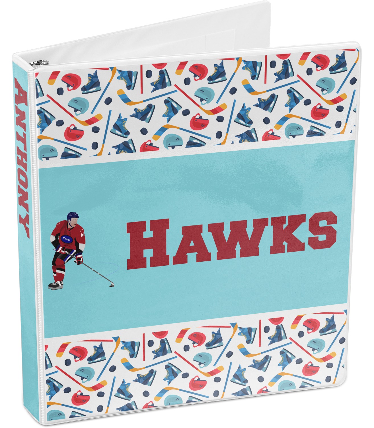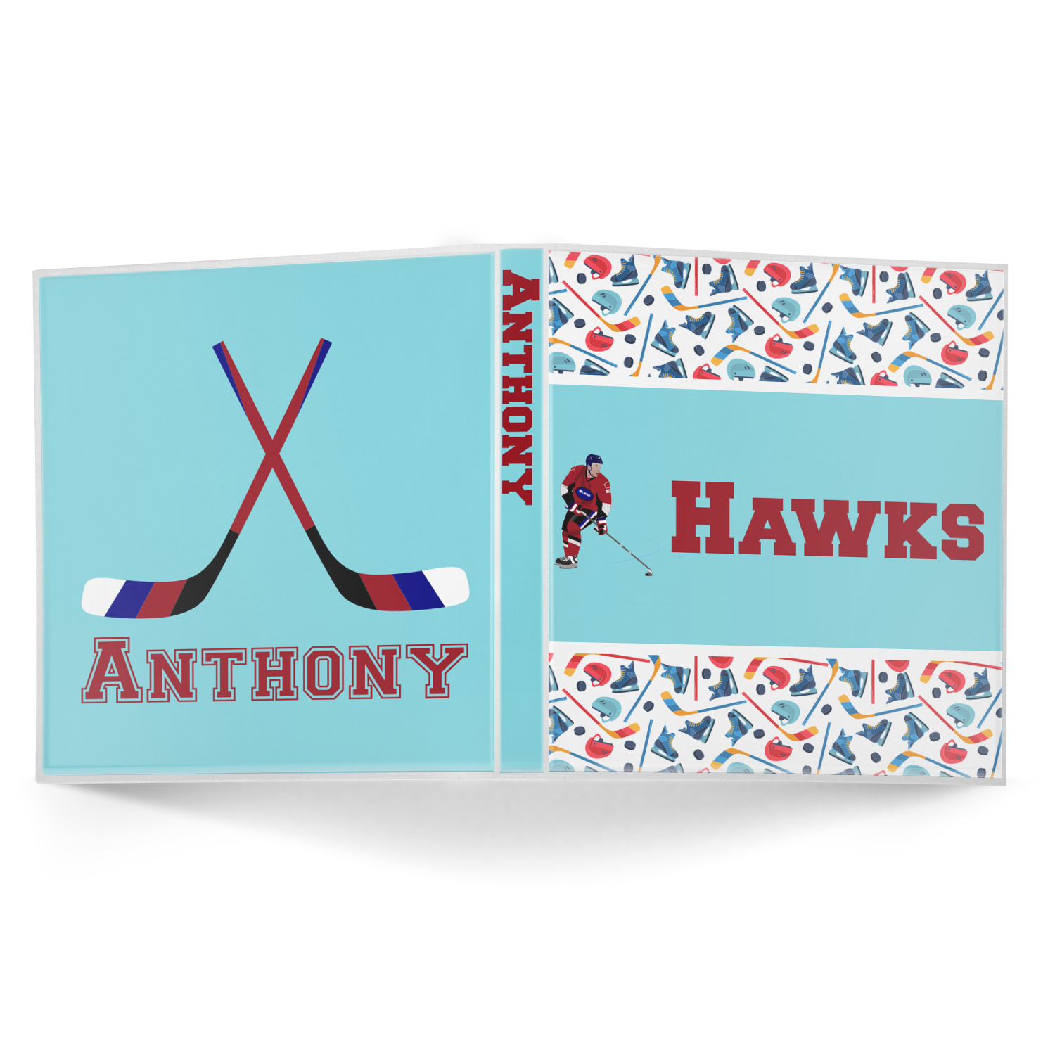 The main design has a fun background with illustrated hockey equipment including a helmet, hockey puck, skate, and hockey sticks. Going through the middle of the design is a solid strip of light teal with a graphic of a hockey player alongside a team name. The coordinating design uses this solid teal background with a hockey stick graphic and personalization.
