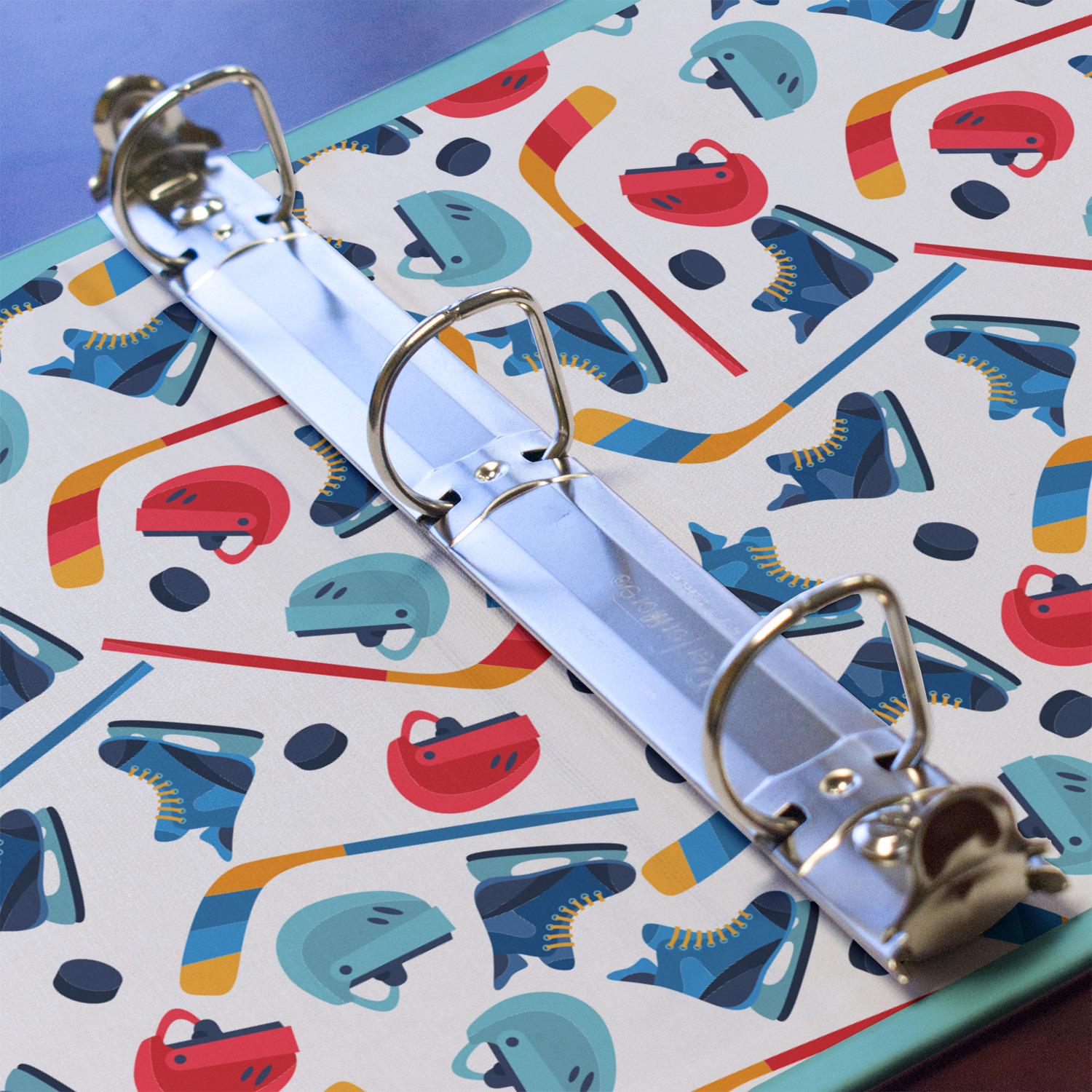 The main design has a fun background with illustrated hockey equipment including a helmet, hockey puck, skate, and hockey sticks. Going through the middle of the design is a solid strip of light teal with a graphic of a hockey player alongside a team name. The coordinating design uses this solid teal background with a hockey stick graphic and personalization.