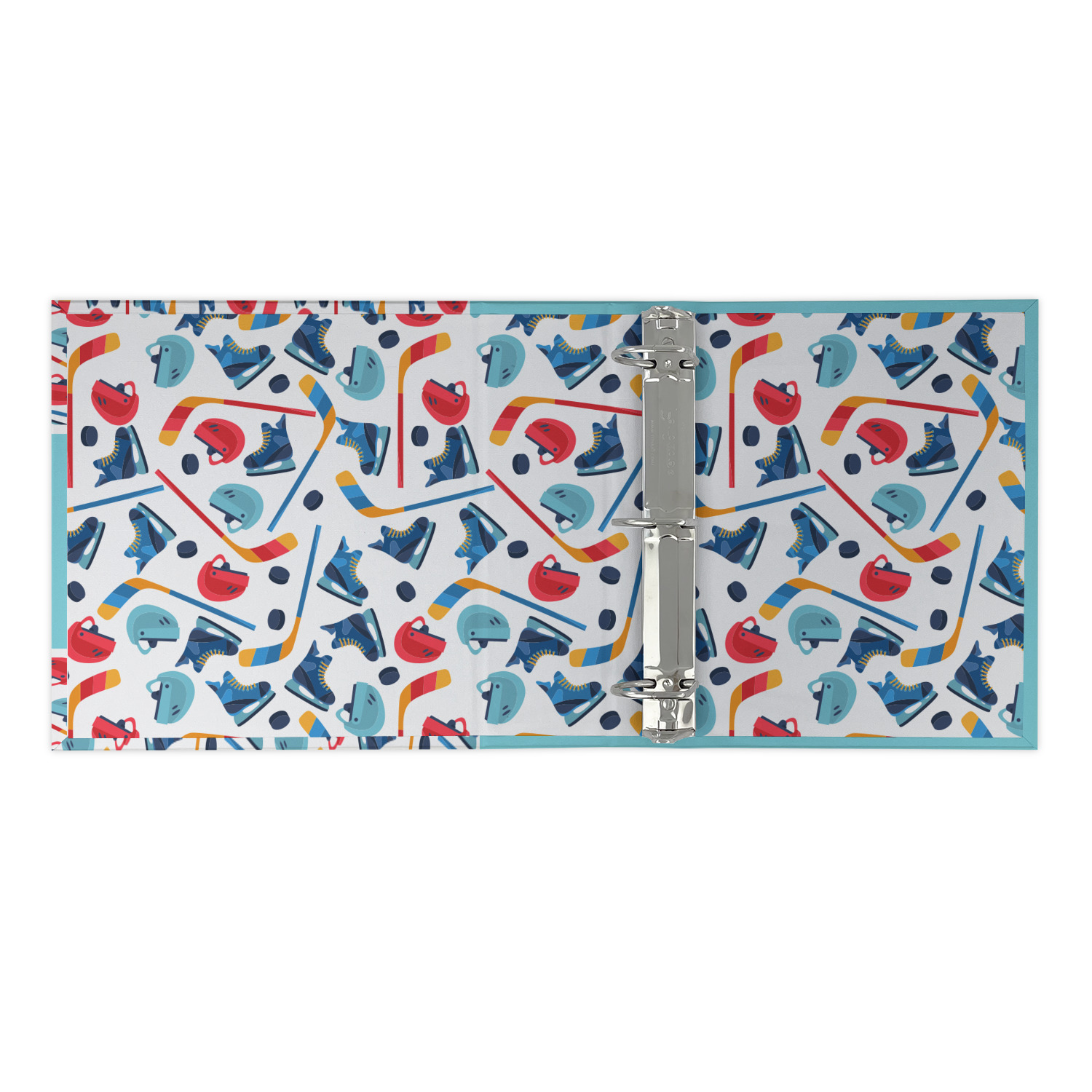 The main design has a fun background with illustrated hockey equipment including a helmet, hockey puck, skate, and hockey sticks. Going through the middle of the design is a solid strip of light teal with a graphic of a hockey player alongside a team name. The coordinating design uses this solid teal background with a hockey stick graphic and personalization.