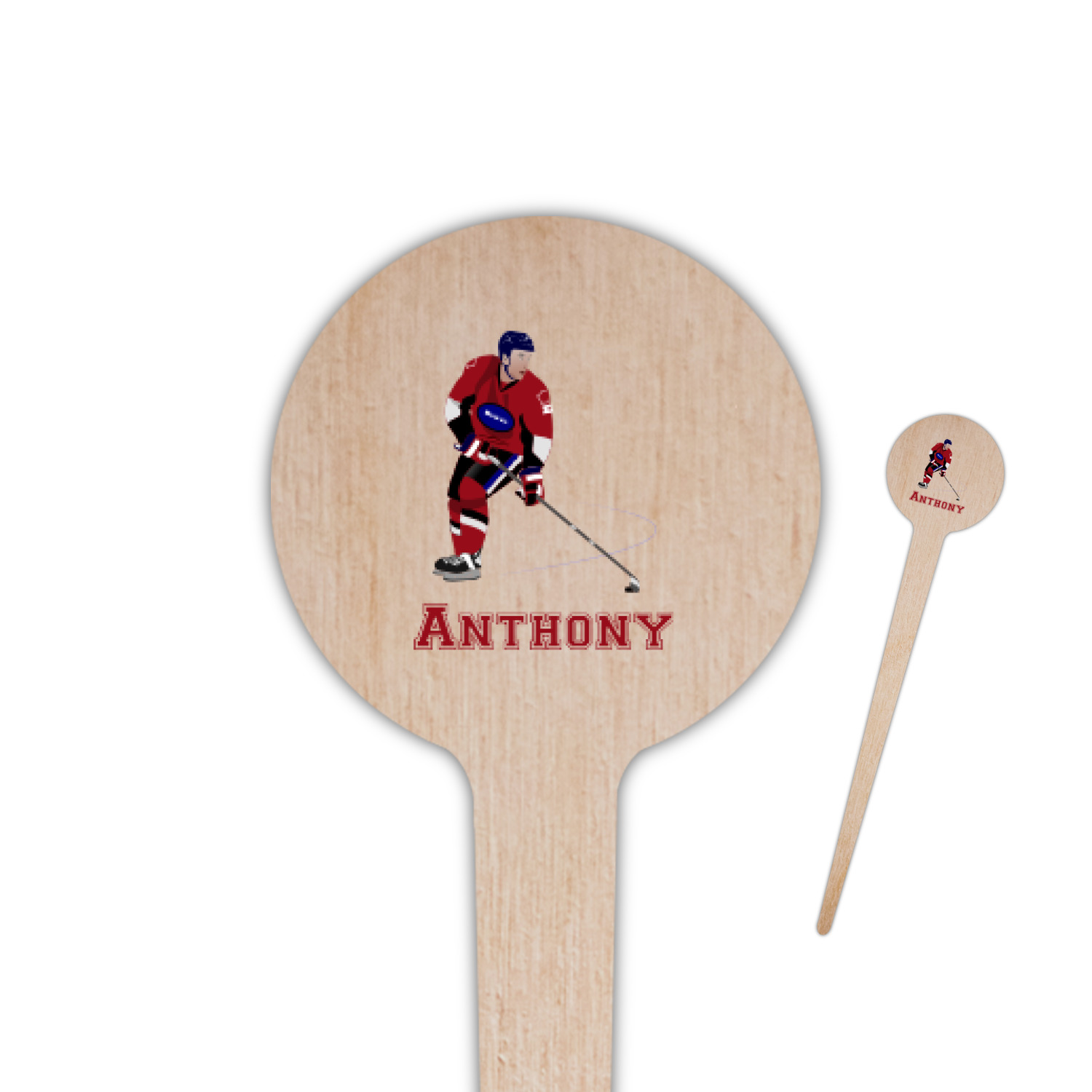 The main design has a fun background with illustrated hockey equipment including a helmet, hockey puck, skate, and hockey sticks. Going through the middle of the design is a solid strip of light teal with a graphic of a hockey player alongside a team name. The coordinating design uses this solid teal background with a hockey stick graphic and personalization.