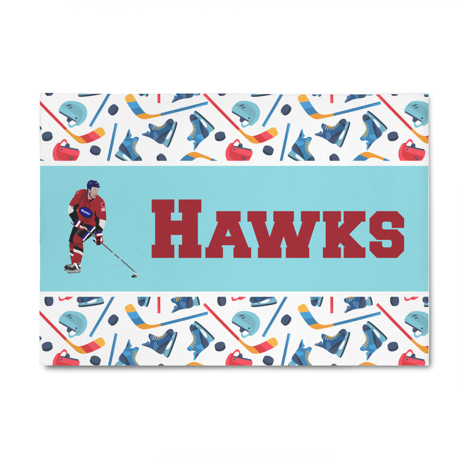 The main design has a fun background with illustrated hockey equipment including a helmet, hockey puck, skate, and hockey sticks. Going through the middle of the design is a solid strip of light teal with a graphic of a hockey player alongside a team name. The coordinating design uses this solid teal background with a hockey stick graphic and personalization.