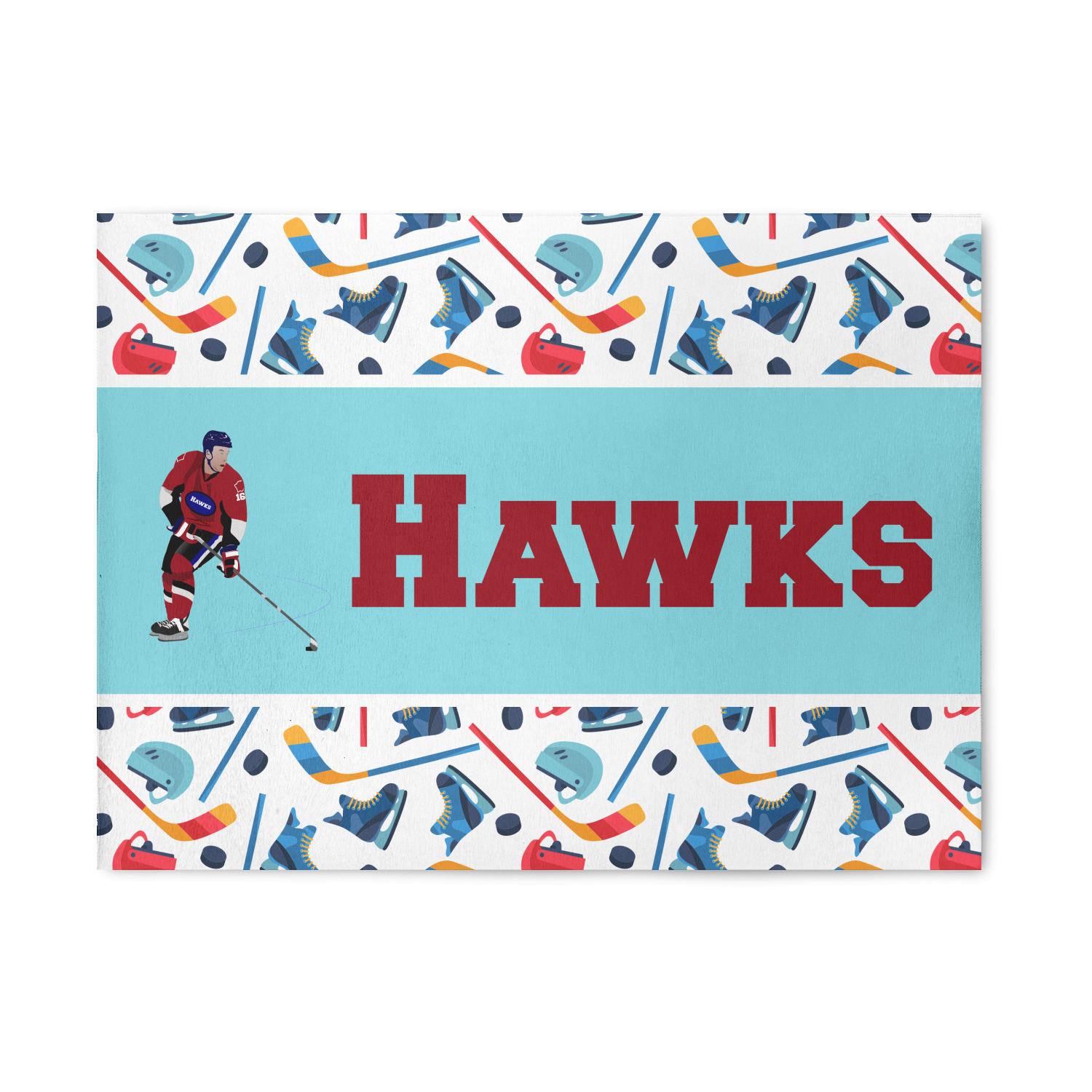The main design has a fun background with illustrated hockey equipment including a helmet, hockey puck, skate, and hockey sticks. Going through the middle of the design is a solid strip of light teal with a graphic of a hockey player alongside a team name. The coordinating design uses this solid teal background with a hockey stick graphic and personalization.
