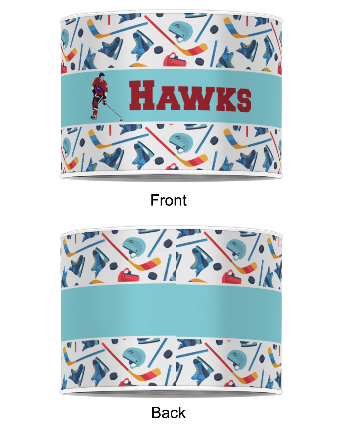 The main design has a fun background with illustrated hockey equipment including a helmet, hockey puck, skate, and hockey sticks. Going through the middle of the design is a solid strip of light teal with a graphic of a hockey player alongside a team name. The coordinating design uses this solid teal background with a hockey stick graphic and personalization.