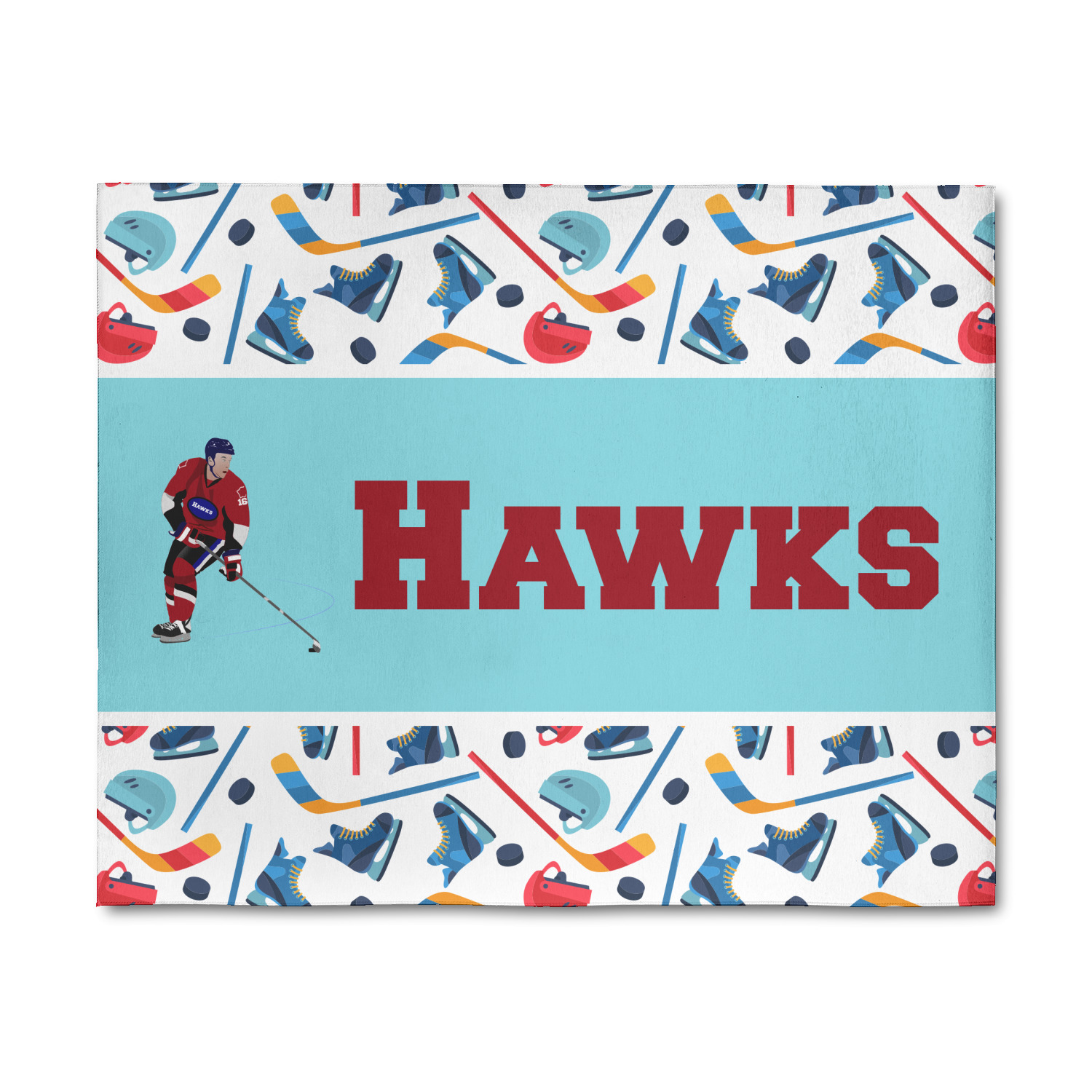 The main design has a fun background with illustrated hockey equipment including a helmet, hockey puck, skate, and hockey sticks. Going through the middle of the design is a solid strip of light teal with a graphic of a hockey player alongside a team name. The coordinating design uses this solid teal background with a hockey stick graphic and personalization.
