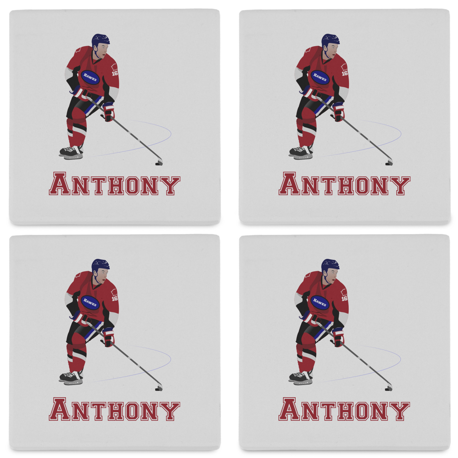 The main design has a fun background with illustrated hockey equipment including a helmet, hockey puck, skate, and hockey sticks. Going through the middle of the design is a solid strip of light teal with a graphic of a hockey player alongside a team name. The coordinating design uses this solid teal background with a hockey stick graphic and personalization.