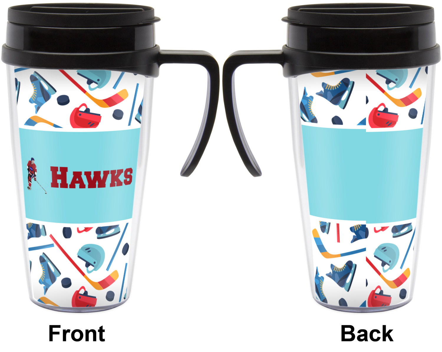 The main design has a fun background with illustrated hockey equipment including a helmet, hockey puck, skate, and hockey sticks. Going through the middle of the design is a solid strip of light teal with a graphic of a hockey player alongside a team name. The coordinating design uses this solid teal background with a hockey stick graphic and personalization.