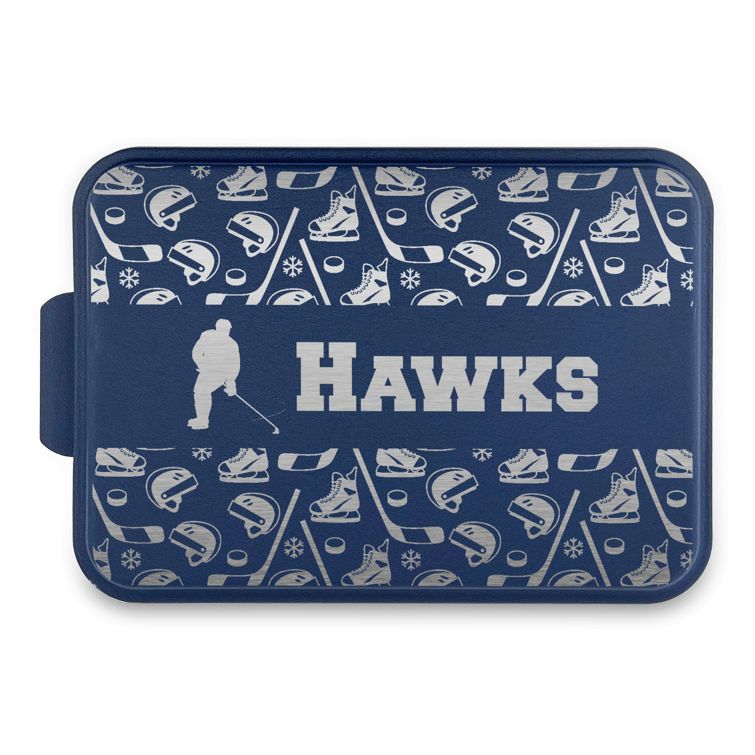 The main design has a fun background with illustrated hockey equipment including a helmet, hockey puck, skate, and hockey sticks. Going through the middle of the design is a solid strip of light teal with a graphic of a hockey player alongside a team name. The coordinating design uses this solid teal background with a hockey stick graphic and personalization.