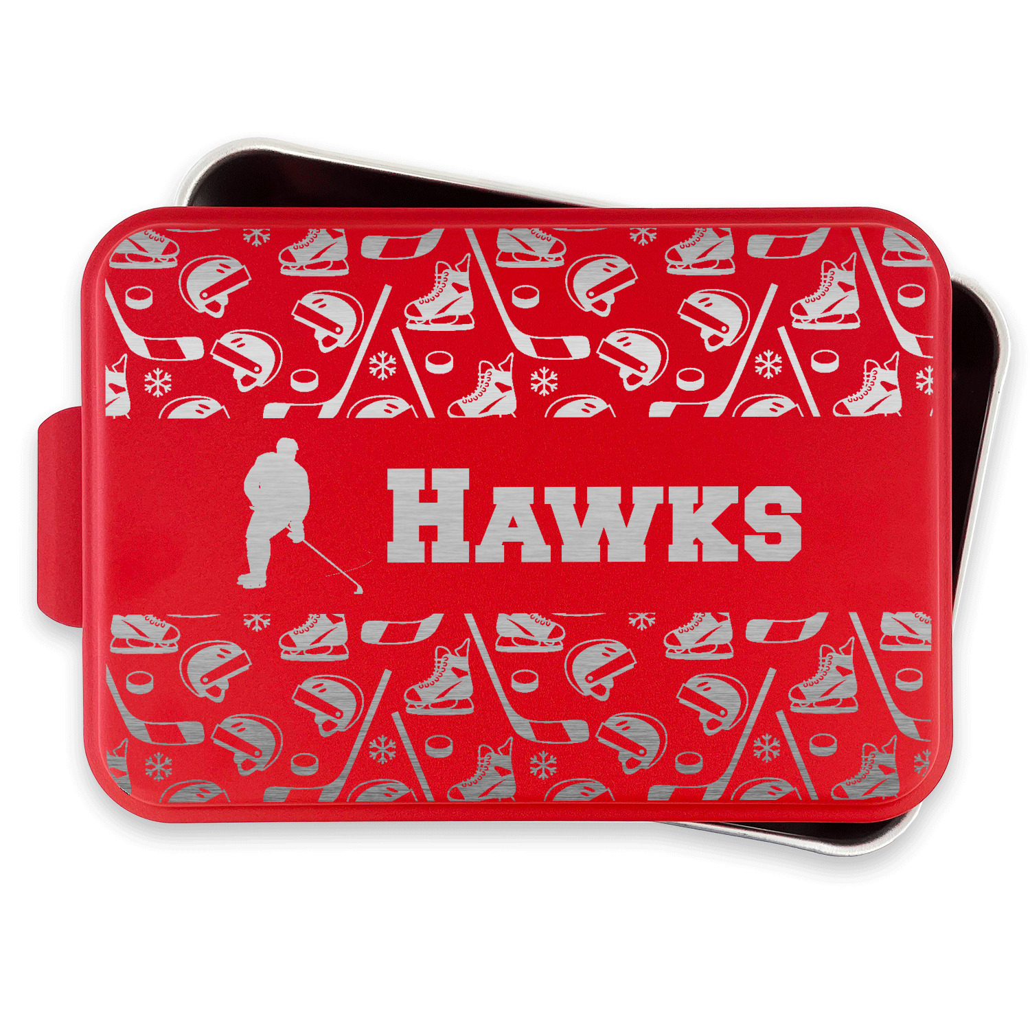 The main design has a fun background with illustrated hockey equipment including a helmet, hockey puck, skate, and hockey sticks. Going through the middle of the design is a solid strip of light teal with a graphic of a hockey player alongside a team name. The coordinating design uses this solid teal background with a hockey stick graphic and personalization.