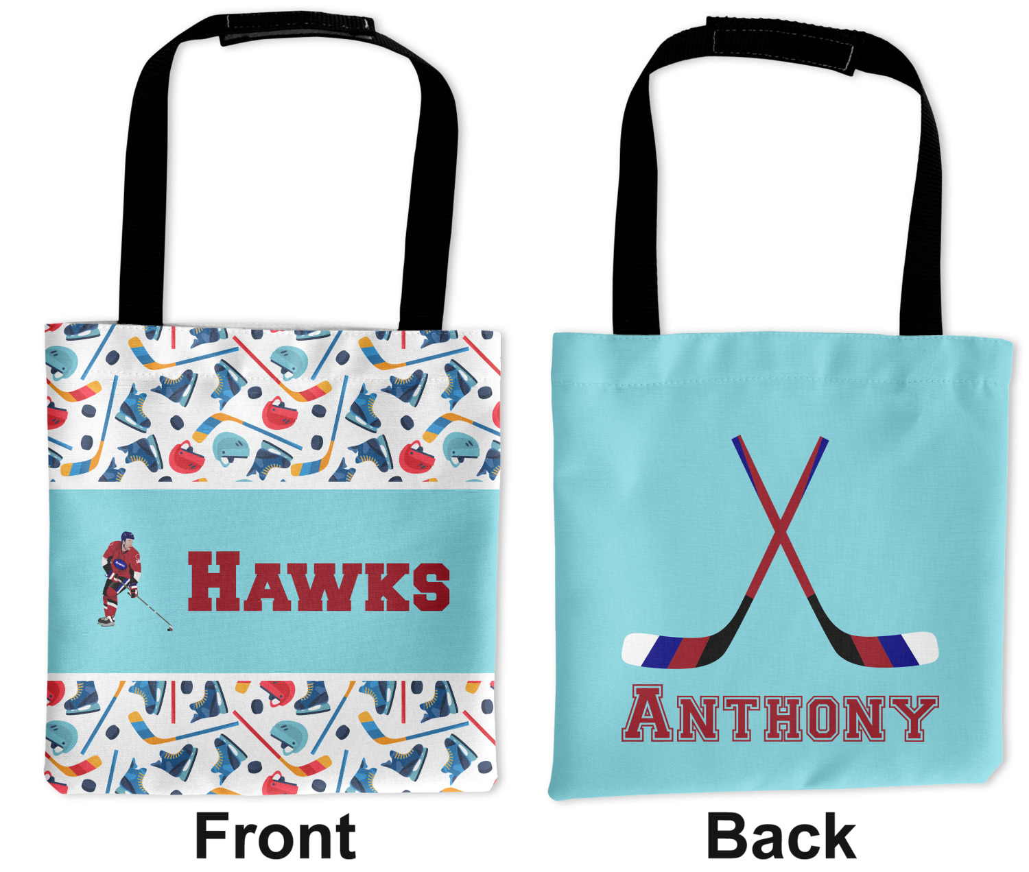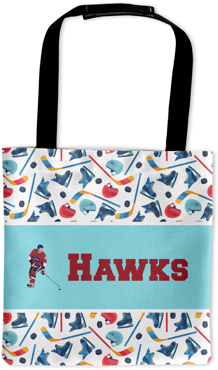 The main design has a fun background with illustrated hockey equipment including a helmet, hockey puck, skate, and hockey sticks. Going through the middle of the design is a solid strip of light teal with a graphic of a hockey player alongside a team name. The coordinating design uses this solid teal background with a hockey stick graphic and personalization.