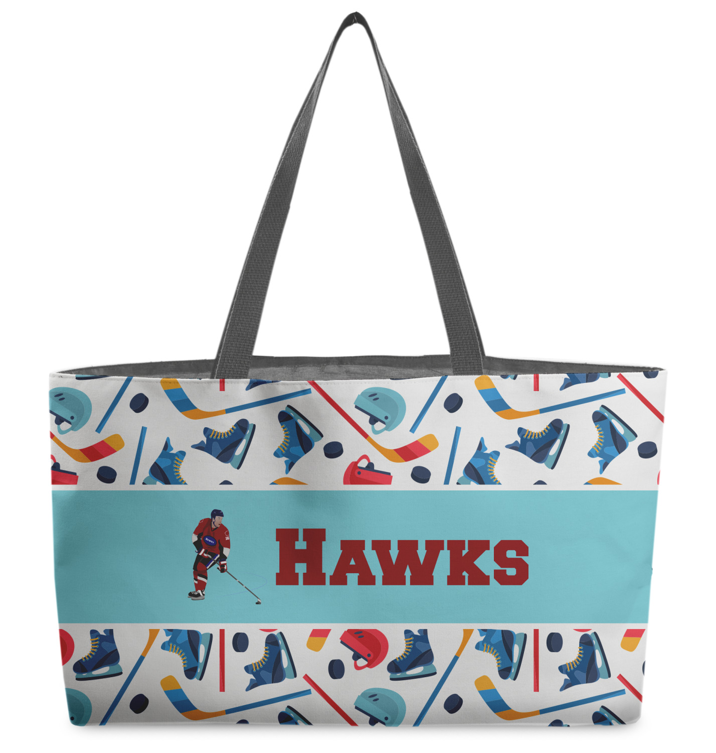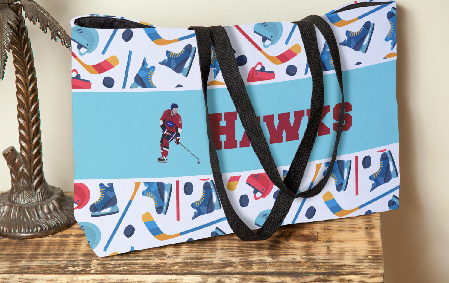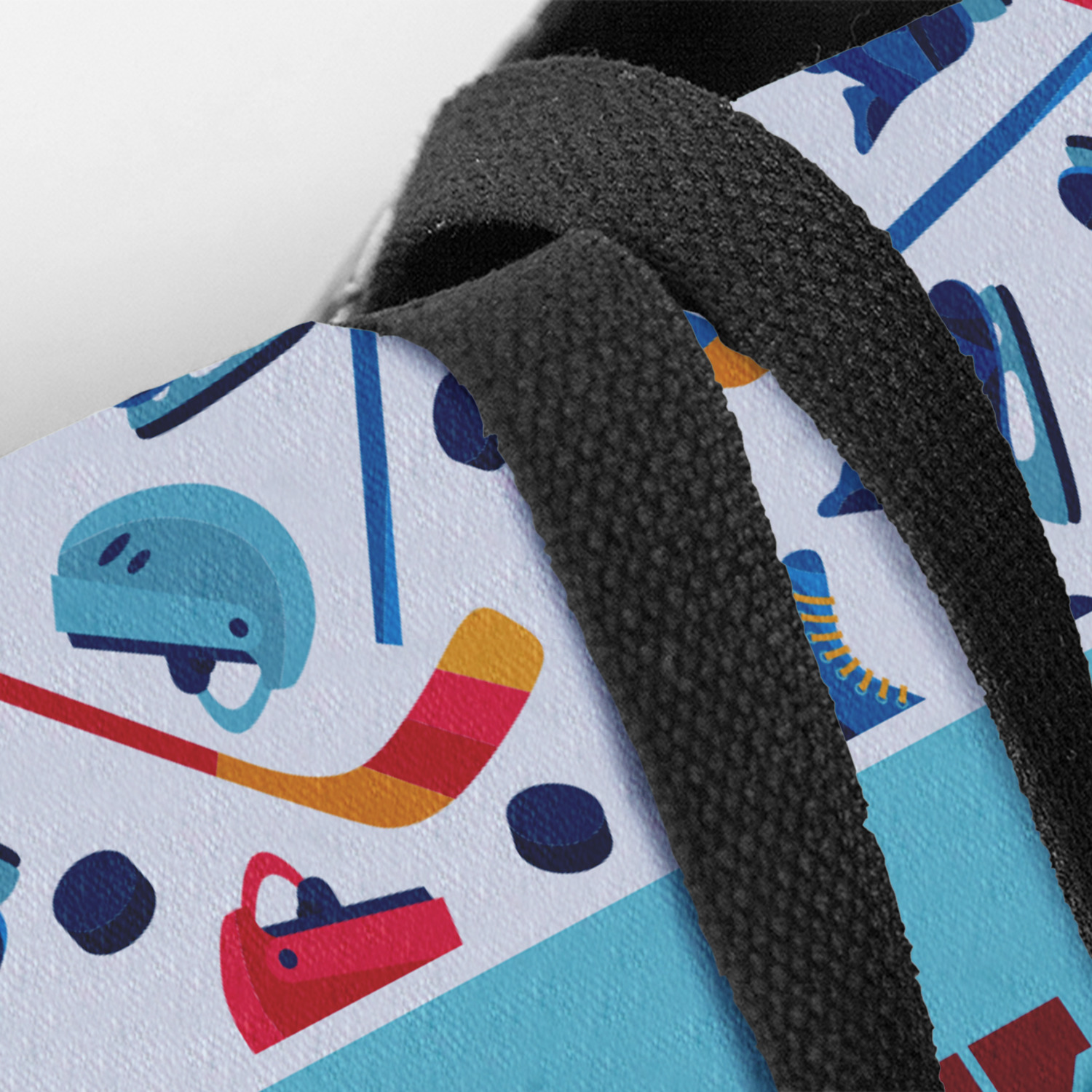 The main design has a fun background with illustrated hockey equipment including a helmet, hockey puck, skate, and hockey sticks. Going through the middle of the design is a solid strip of light teal with a graphic of a hockey player alongside a team name. The coordinating design uses this solid teal background with a hockey stick graphic and personalization.
