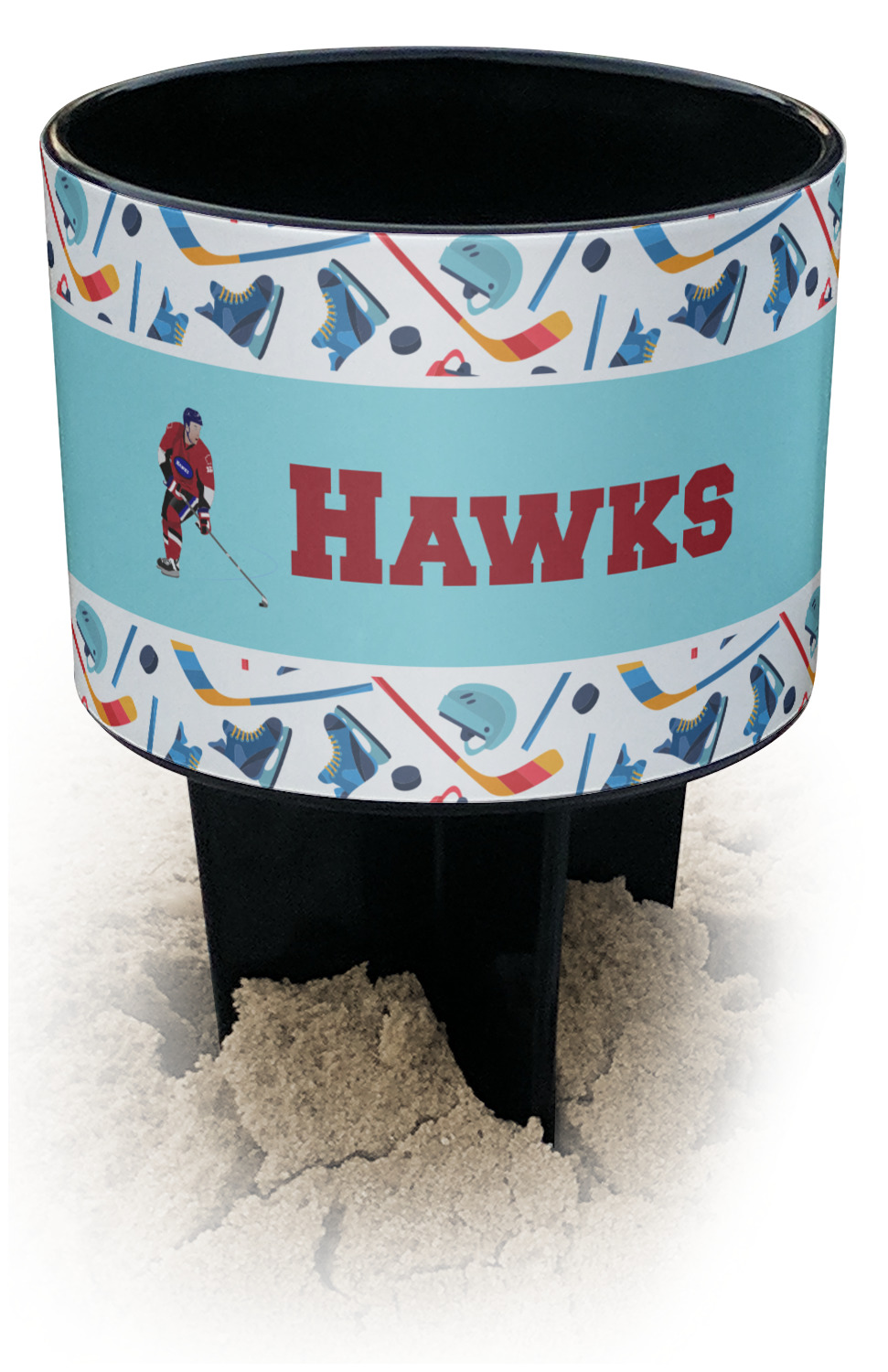 This cup holder has a large stake at its bottom that anchors it to the sand or ground below, while the cup holder rests above the stake. The entire drink holder is made of durable plastic and displays your customization around the cup holder portion. We sell these personalized beach spikers in two different colors: black and white.