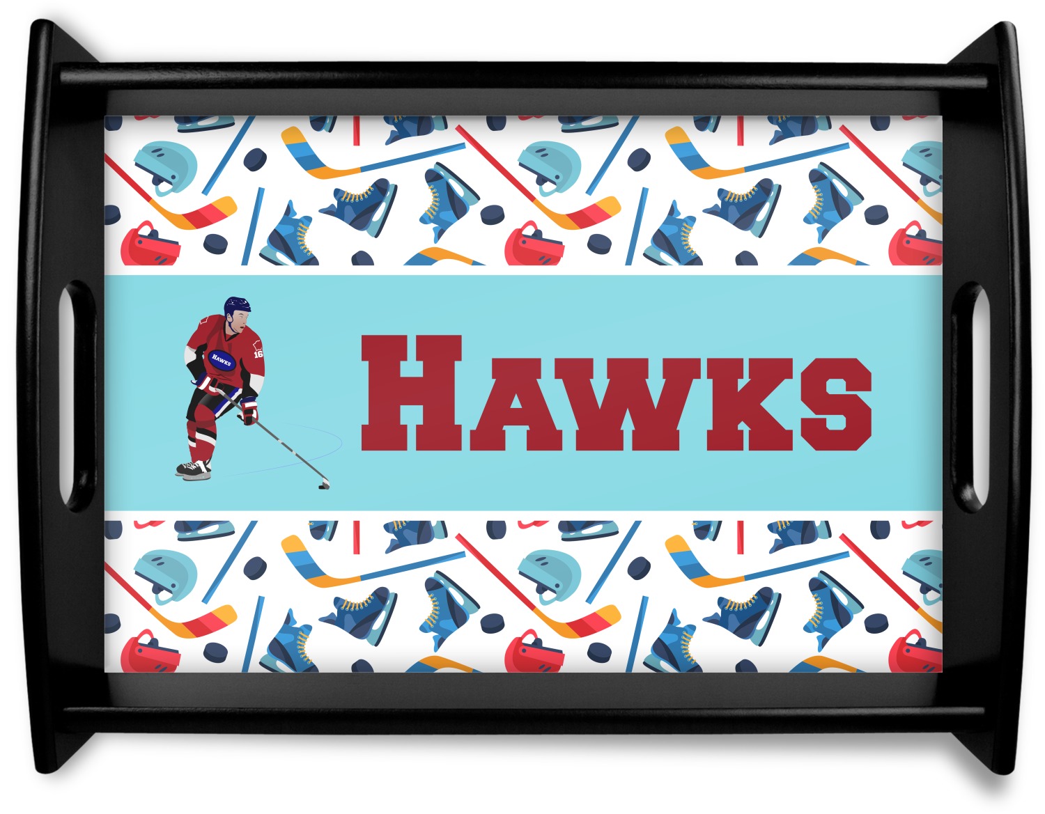 The main design has a fun background with illustrated hockey equipment including a helmet, hockey puck, skate, and hockey sticks. Going through the middle of the design is a solid strip of light teal with a graphic of a hockey player alongside a team name. The coordinating design uses this solid teal background with a hockey stick graphic and personalization.