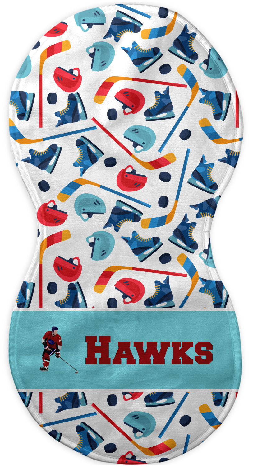 The main design has a fun background with illustrated hockey equipment including a helmet, hockey puck, skate, and hockey sticks. Going through the middle of the design is a solid strip of light teal with a graphic of a hockey player alongside a team name. The coordinating design uses this solid teal background with a hockey stick graphic and personalization.