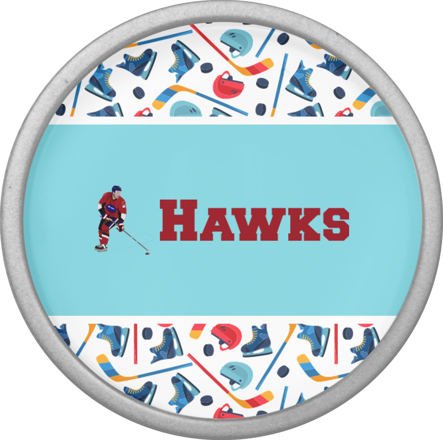 The main design has a fun background with illustrated hockey equipment including a helmet, hockey puck, skate, and hockey sticks. Going through the middle of the design is a solid strip of light teal with a graphic of a hockey player alongside a team name. The coordinating design uses this solid teal background with a hockey stick graphic and personalization.