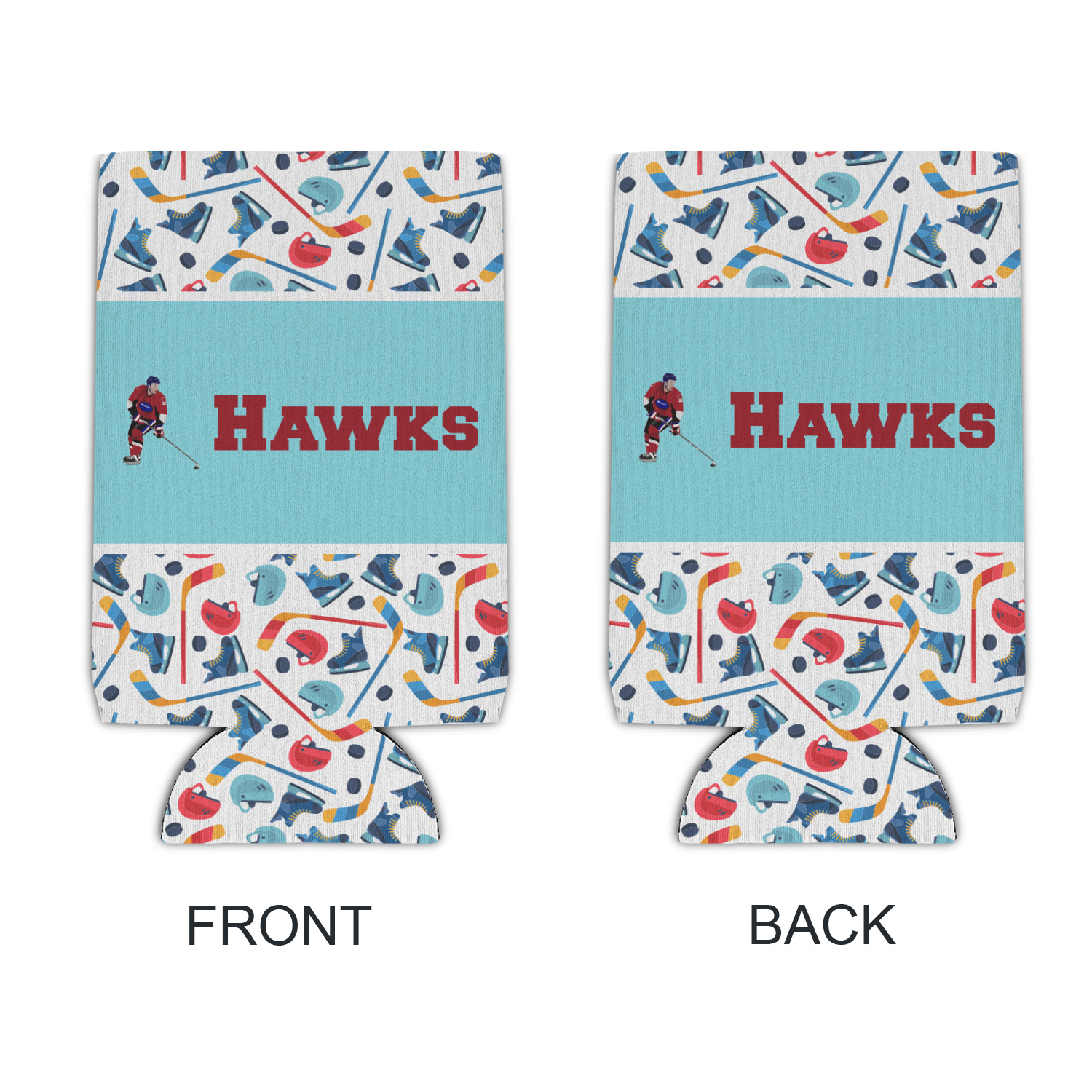 The main design has a fun background with illustrated hockey equipment including a helmet, hockey puck, skate, and hockey sticks. Going through the middle of the design is a solid strip of light teal with a graphic of a hockey player alongside a team name. The coordinating design uses this solid teal background with a hockey stick graphic and personalization.