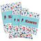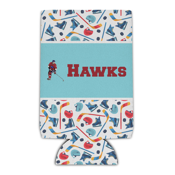 The main design has a fun background with illustrated hockey equipment including a helmet, hockey puck, skate, and hockey sticks. Going through the middle of the design is a solid strip of light teal with a graphic of a hockey player alongside a team name. The coordinating design uses this solid teal background with a hockey stick graphic and personalization.
