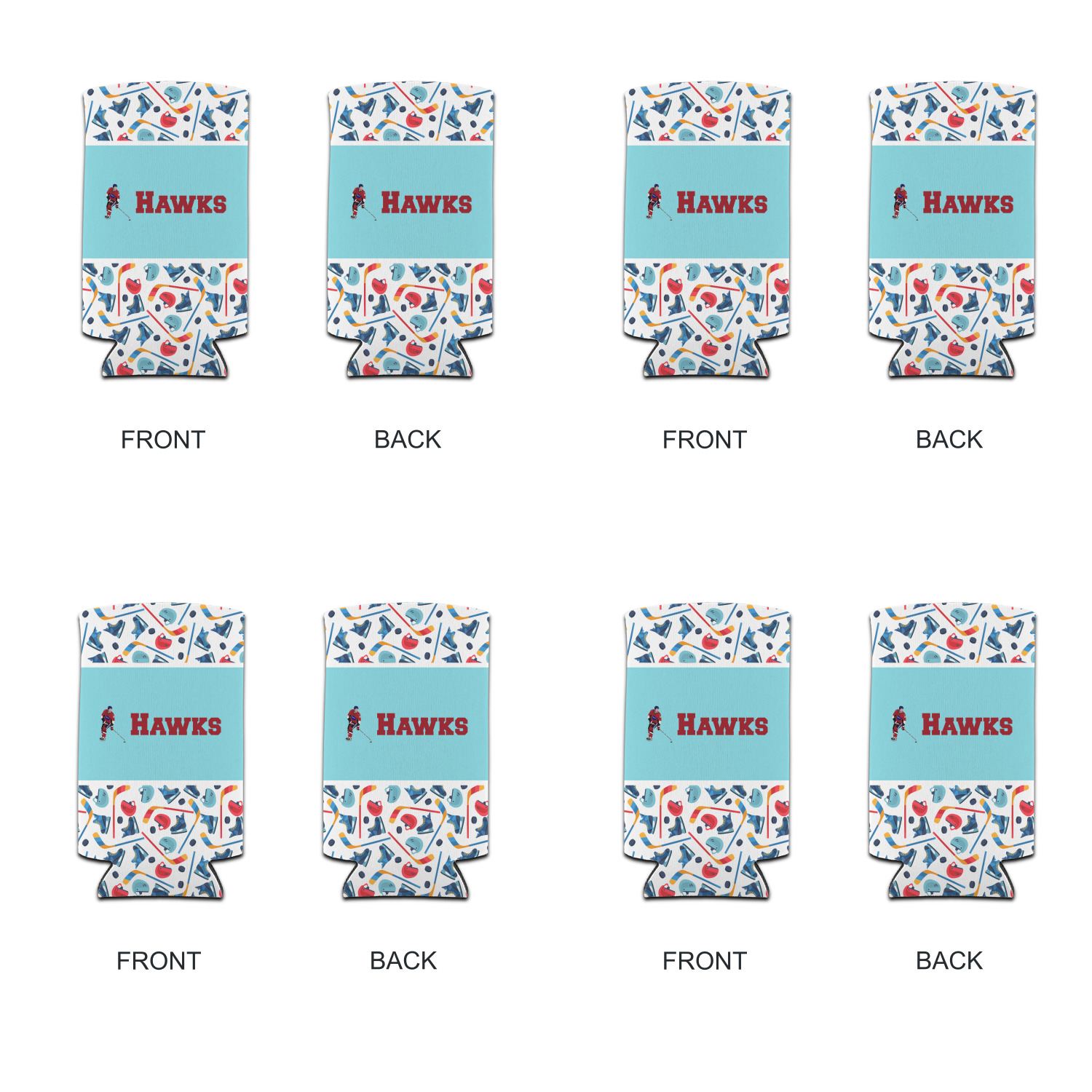The main design has a fun background with illustrated hockey equipment including a helmet, hockey puck, skate, and hockey sticks. Going through the middle of the design is a solid strip of light teal with a graphic of a hockey player alongside a team name. The coordinating design uses this solid teal background with a hockey stick graphic and personalization.