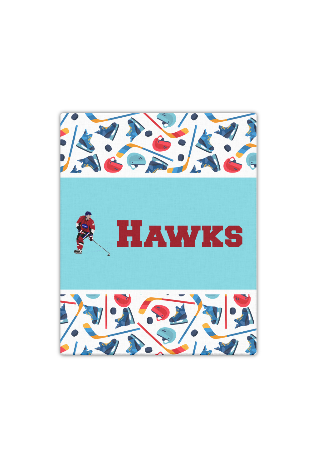 The main design has a fun background with illustrated hockey equipment including a helmet, hockey puck, skate, and hockey sticks. Going through the middle of the design is a solid strip of light teal with a graphic of a hockey player alongside a team name. The coordinating design uses this solid teal background with a hockey stick graphic and personalization.