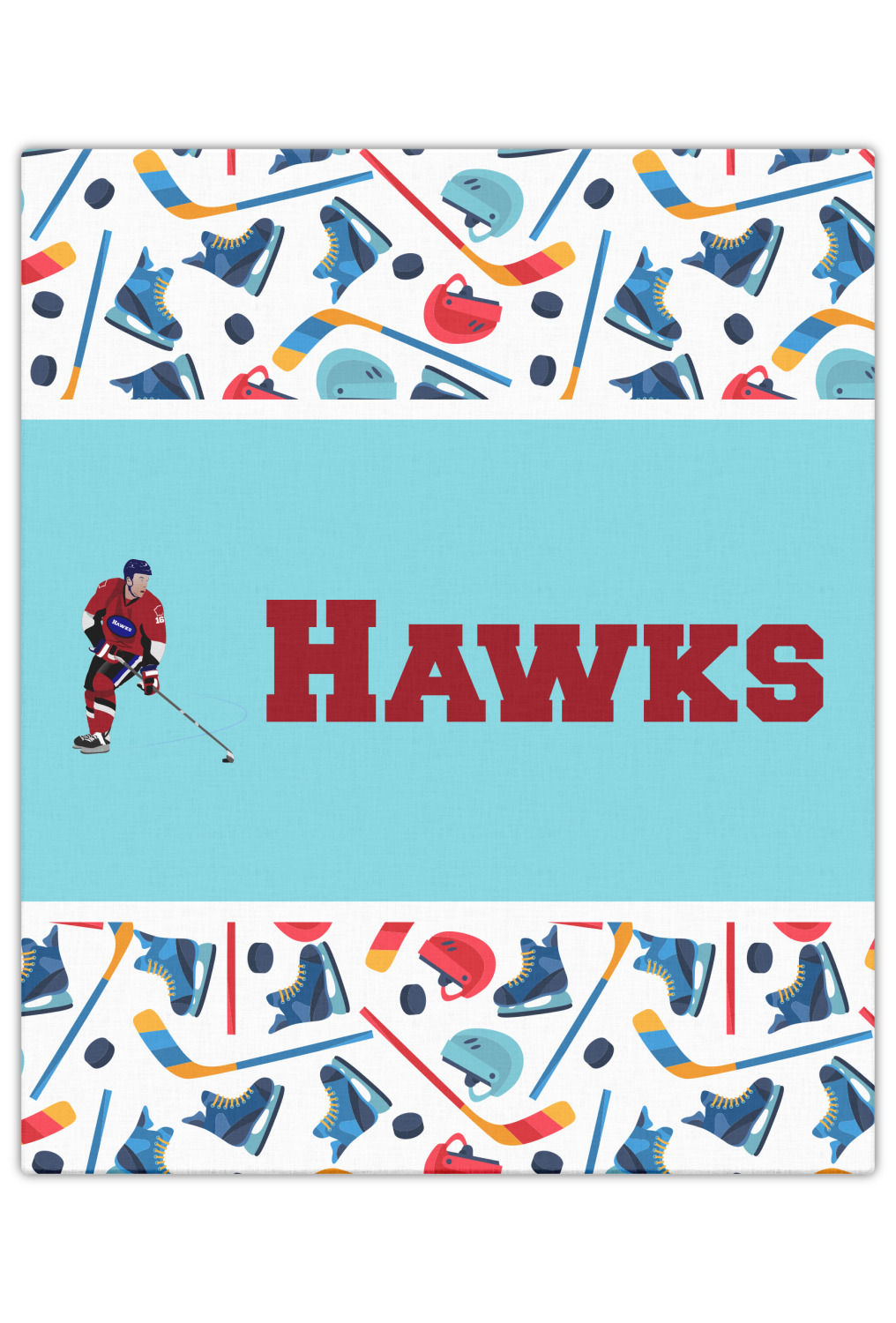 The main design has a fun background with illustrated hockey equipment including a helmet, hockey puck, skate, and hockey sticks. Going through the middle of the design is a solid strip of light teal with a graphic of a hockey player alongside a team name. The coordinating design uses this solid teal background with a hockey stick graphic and personalization.