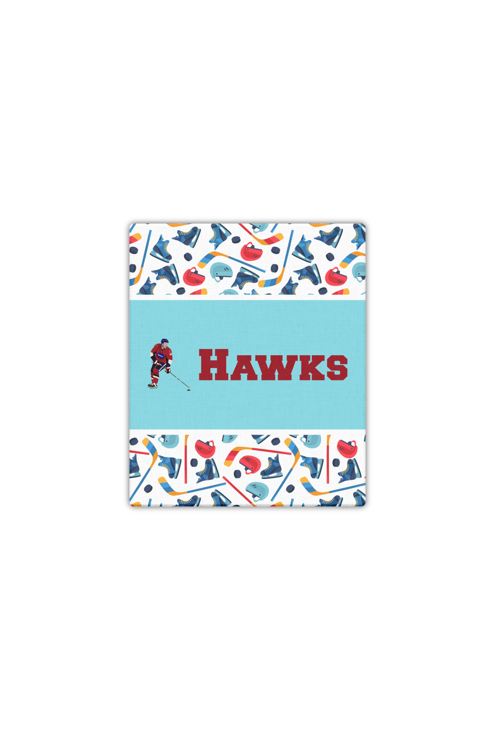 The main design has a fun background with illustrated hockey equipment including a helmet, hockey puck, skate, and hockey sticks. Going through the middle of the design is a solid strip of light teal with a graphic of a hockey player alongside a team name. The coordinating design uses this solid teal background with a hockey stick graphic and personalization.