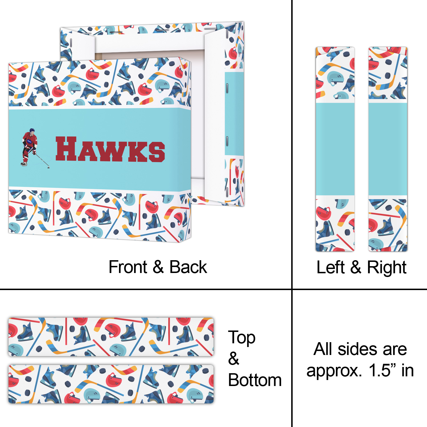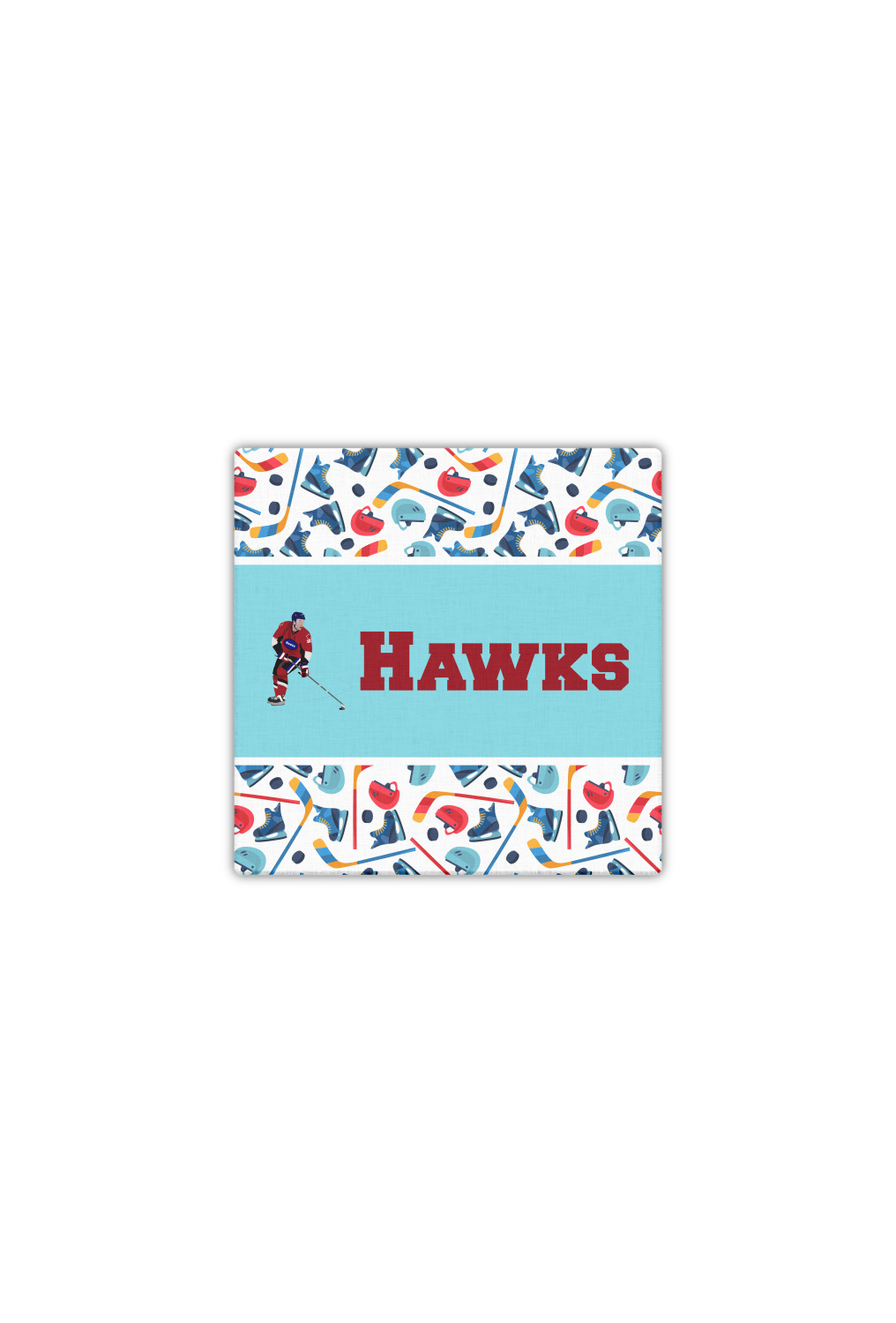 The main design has a fun background with illustrated hockey equipment including a helmet, hockey puck, skate, and hockey sticks. Going through the middle of the design is a solid strip of light teal with a graphic of a hockey player alongside a team name. The coordinating design uses this solid teal background with a hockey stick graphic and personalization.