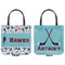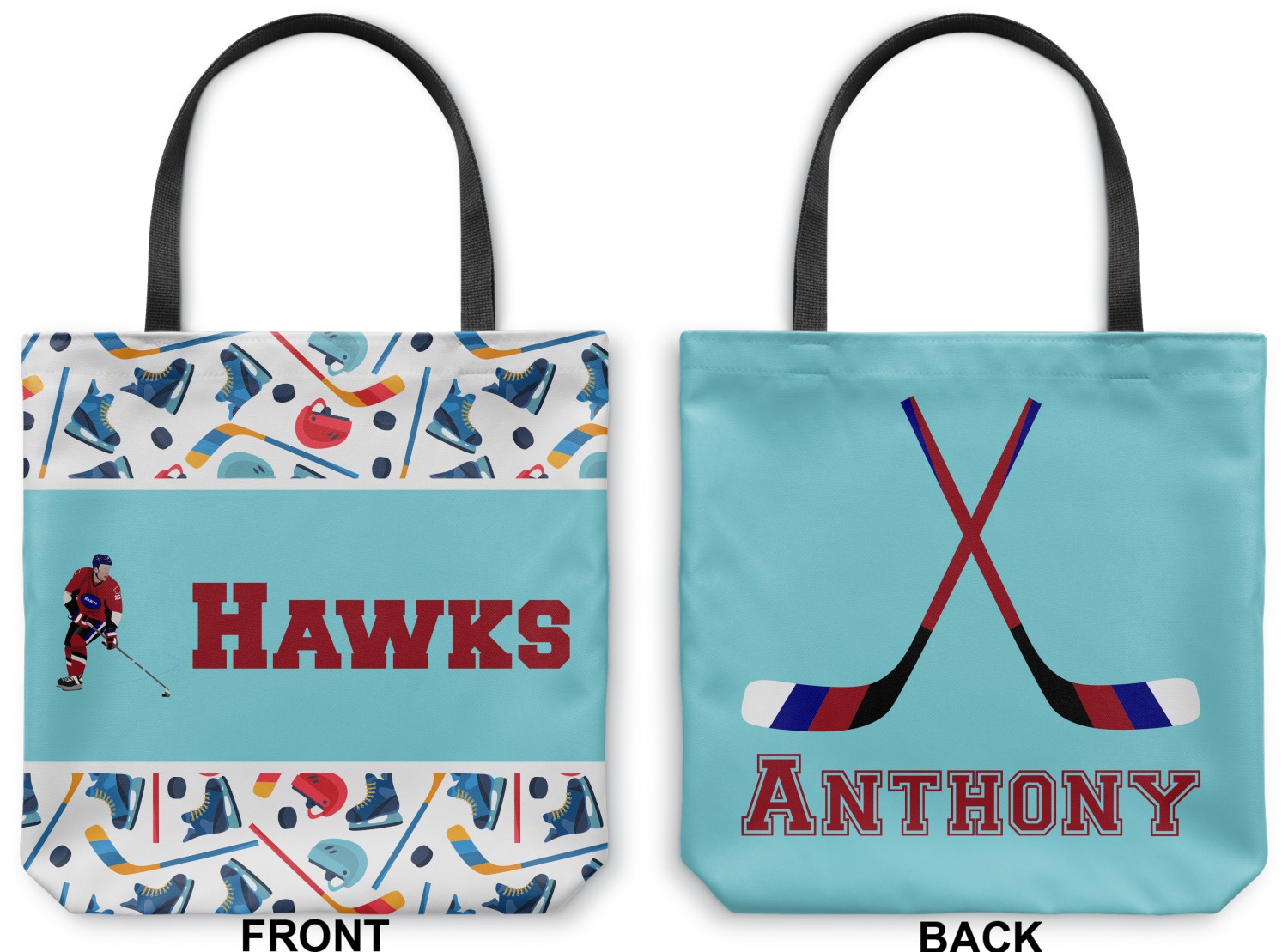 The main design has a fun background with illustrated hockey equipment including a helmet, hockey puck, skate, and hockey sticks. Going through the middle of the design is a solid strip of light teal with a graphic of a hockey player alongside a team name. The coordinating design uses this solid teal background with a hockey stick graphic and personalization.
