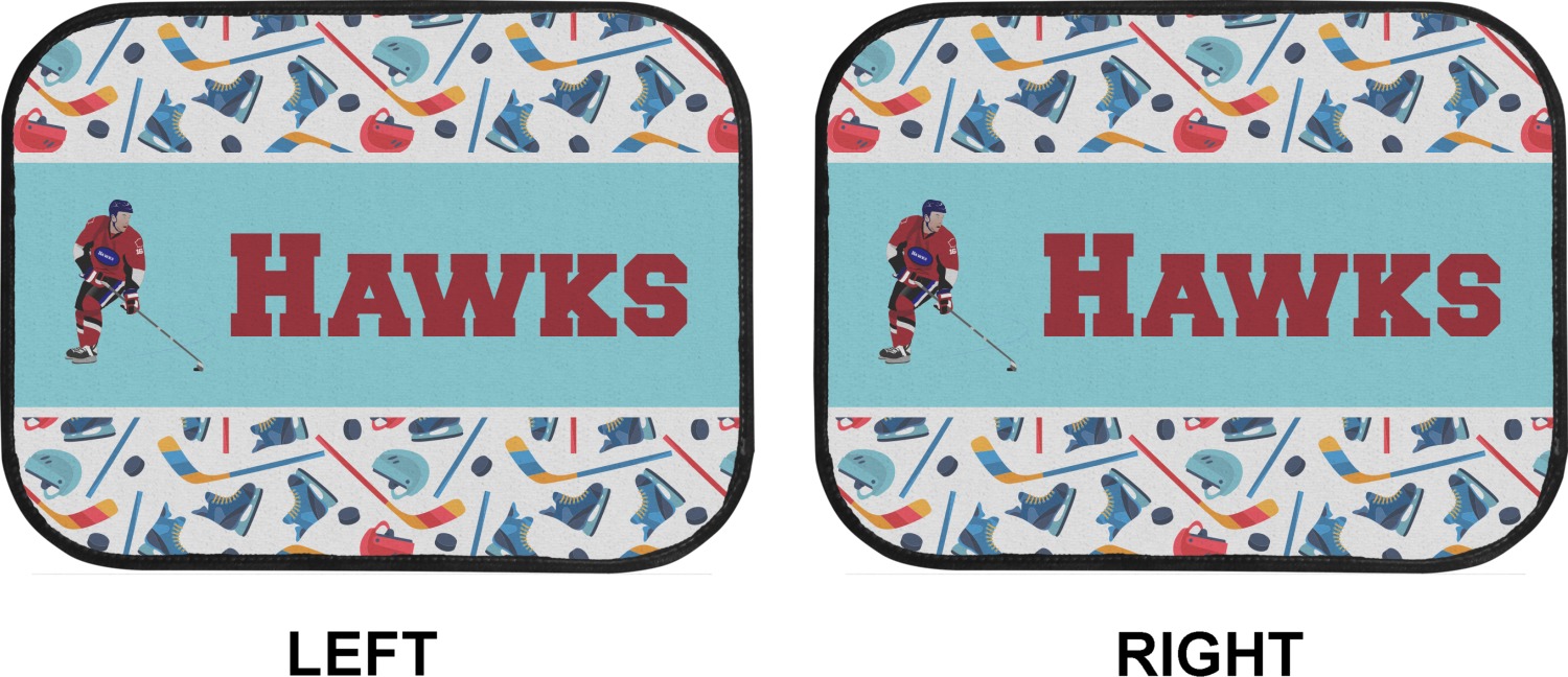 The main design has a fun background with illustrated hockey equipment including a helmet, hockey puck, skate, and hockey sticks. Going through the middle of the design is a solid strip of light teal with a graphic of a hockey player alongside a team name. The coordinating design uses this solid teal background with a hockey stick graphic and personalization.