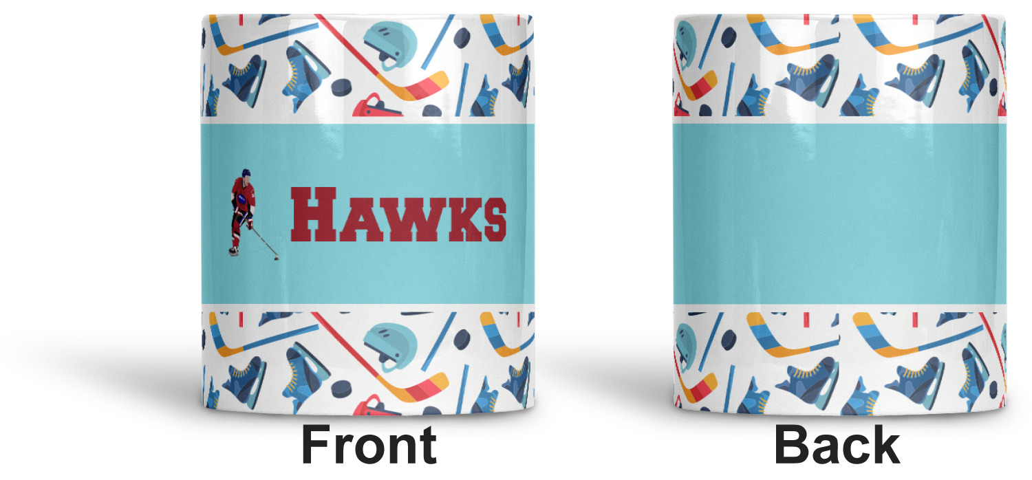 The main design has a fun background with illustrated hockey equipment including a helmet, hockey puck, skate, and hockey sticks. Going through the middle of the design is a solid strip of light teal with a graphic of a hockey player alongside a team name. The coordinating design uses this solid teal background with a hockey stick graphic and personalization.