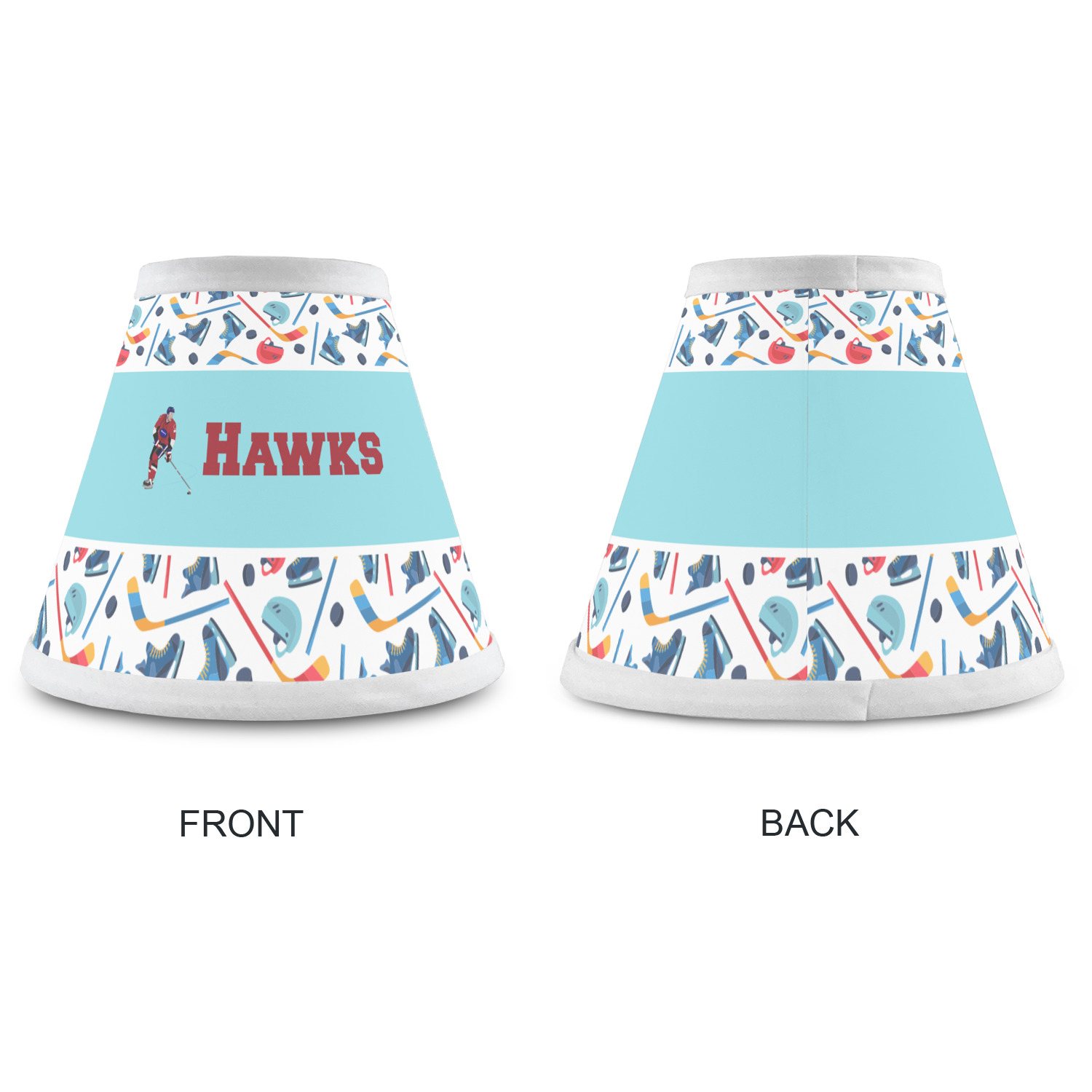 The main design has a fun background with illustrated hockey equipment including a helmet, hockey puck, skate, and hockey sticks. Going through the middle of the design is a solid strip of light teal with a graphic of a hockey player alongside a team name. The coordinating design uses this solid teal background with a hockey stick graphic and personalization.