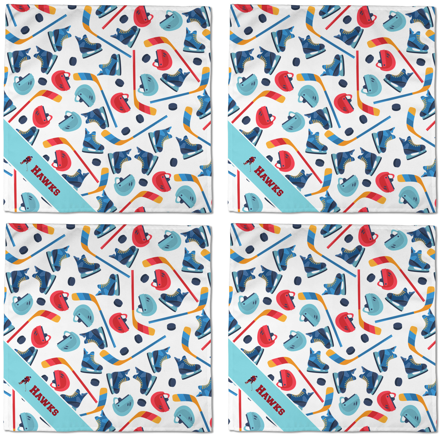 The main design has a fun background with illustrated hockey equipment including a helmet, hockey puck, skate, and hockey sticks. Going through the middle of the design is a solid strip of light teal with a graphic of a hockey player alongside a team name. The coordinating design uses this solid teal background with a hockey stick graphic and personalization.
