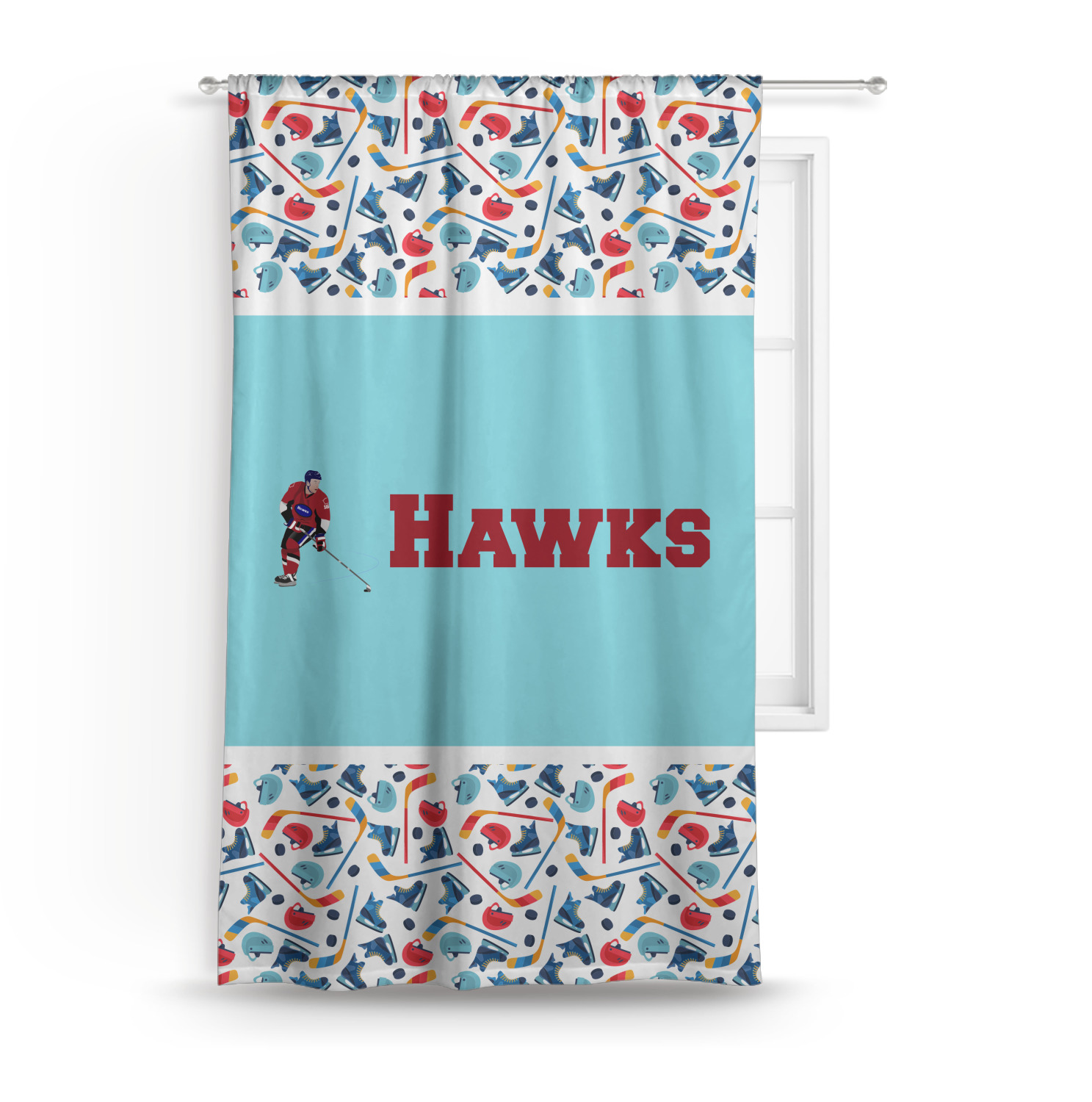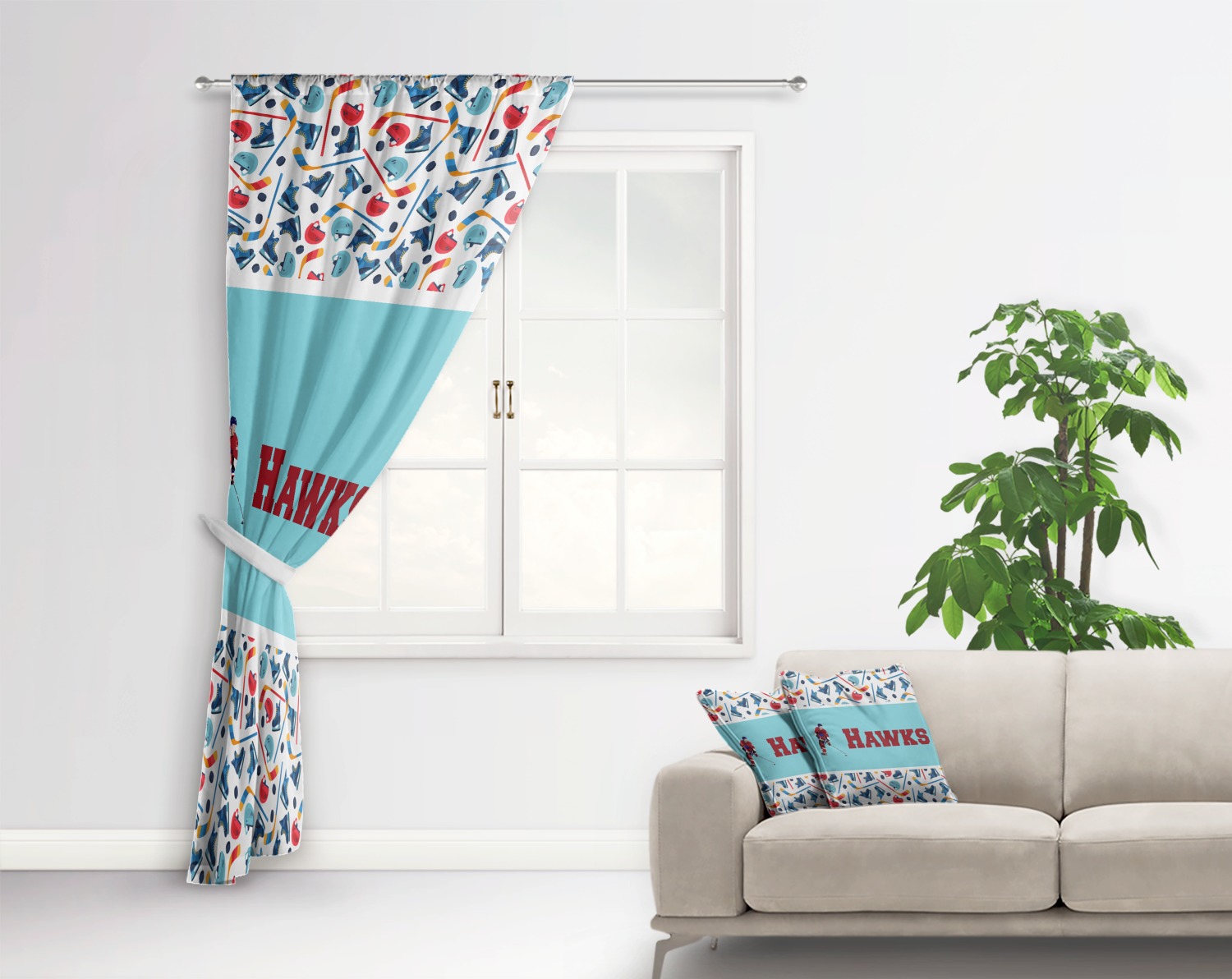 The main design has a fun background with illustrated hockey equipment including a helmet, hockey puck, skate, and hockey sticks. Going through the middle of the design is a solid strip of light teal with a graphic of a hockey player alongside a team name. The coordinating design uses this solid teal background with a hockey stick graphic and personalization.