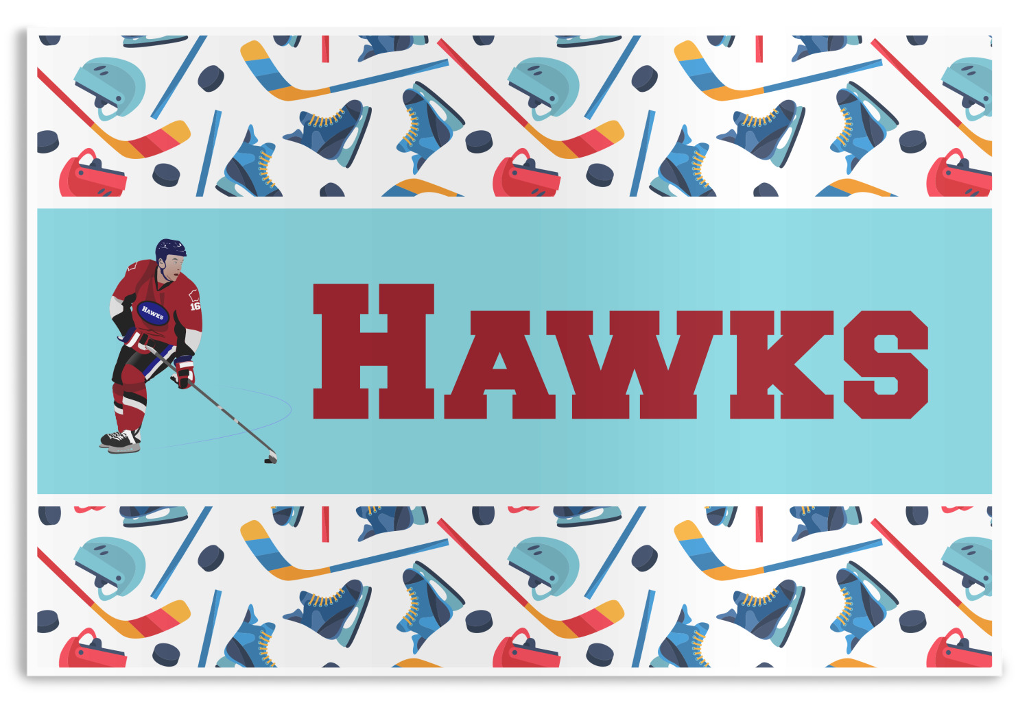 The main design has a fun background with illustrated hockey equipment including a helmet, hockey puck, skate, and hockey sticks. Going through the middle of the design is a solid strip of light teal with a graphic of a hockey player alongside a team name. The coordinating design uses this solid teal background with a hockey stick graphic and personalization.