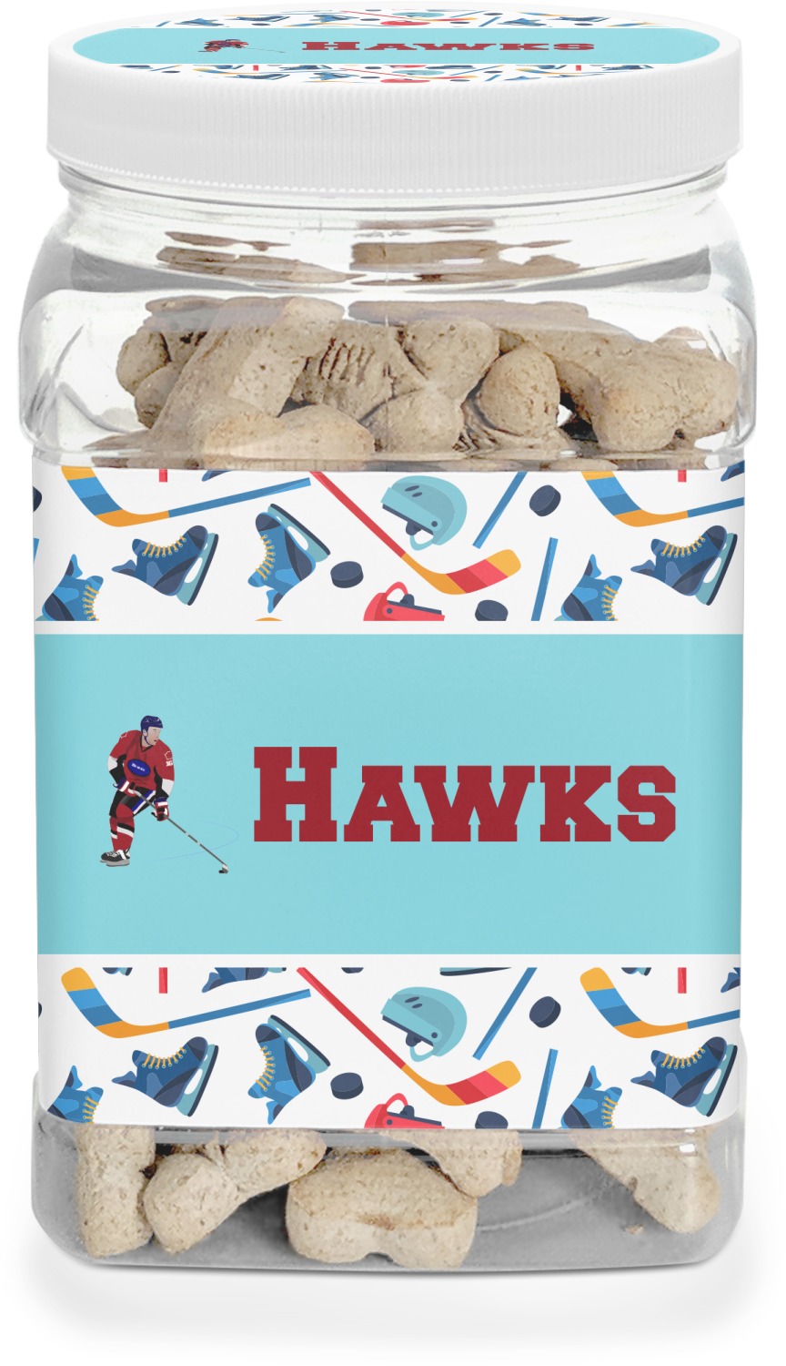 This half gallon jar, made from a sturdy plastic, is the perfect way to keep treats from any naughty pet paws, while still keeping them ready on hand for when your pup performs an impressive trick. This dog cookie jar features a screw-on, white lid that displays your personalized design on a vinyl sticker. We apply another customized sticker that wraps around the front and sides of the jar. Our dog treat jar also has indentations on the rear ends of the sides, which allows for convenient handling, and its square frame allows for easy storage.