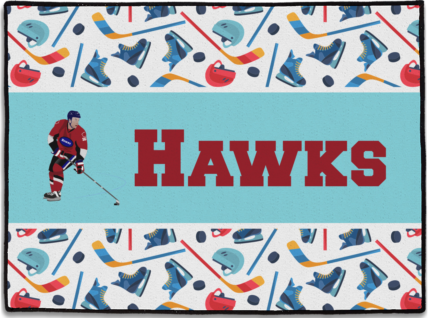 The main design has a fun background with illustrated hockey equipment including a helmet, hockey puck, skate, and hockey sticks. Going through the middle of the design is a solid strip of light teal with a graphic of a hockey player alongside a team name. The coordinating design uses this solid teal background with a hockey stick graphic and personalization.