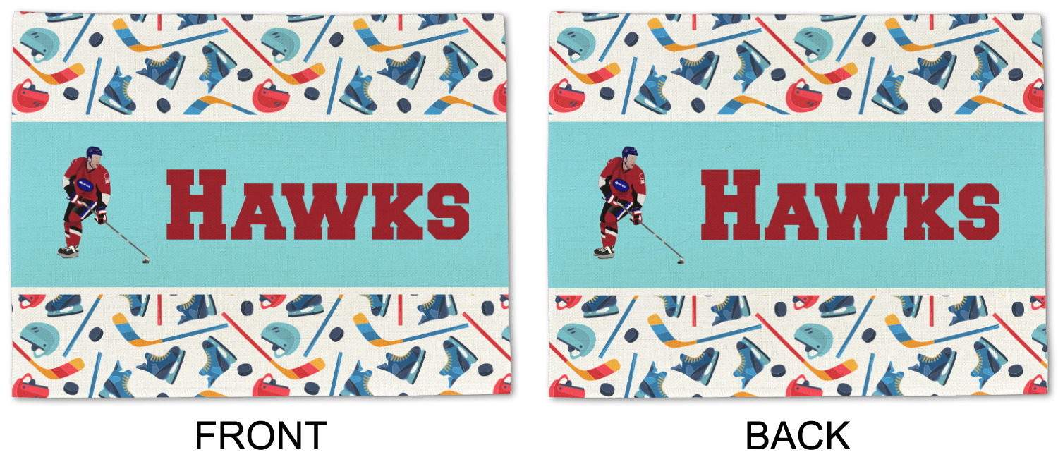 The main design has a fun background with illustrated hockey equipment including a helmet, hockey puck, skate, and hockey sticks. Going through the middle of the design is a solid strip of light teal with a graphic of a hockey player alongside a team name. The coordinating design uses this solid teal background with a hockey stick graphic and personalization.