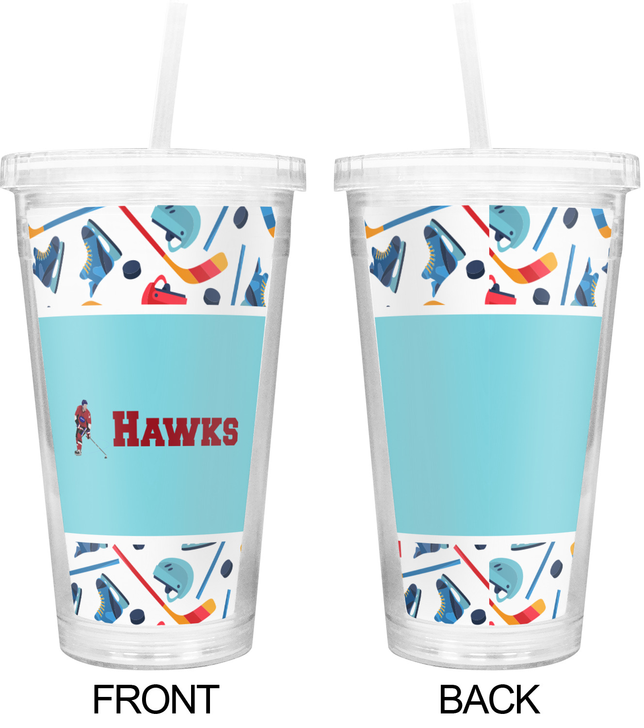 The main design has a fun background with illustrated hockey equipment including a helmet, hockey puck, skate, and hockey sticks. Going through the middle of the design is a solid strip of light teal with a graphic of a hockey player alongside a team name. The coordinating design uses this solid teal background with a hockey stick graphic and personalization.