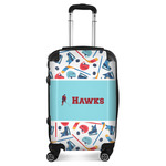 The main design has a fun background with illustrated hockey equipment including a helmet, hockey puck, skate, and hockey sticks. Going through the middle of the design is a solid strip of light teal with a graphic of a hockey player alongside a team name. The coordinating design uses this solid teal background with a hockey stick graphic and personalization.