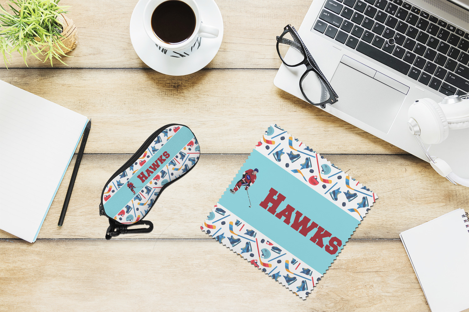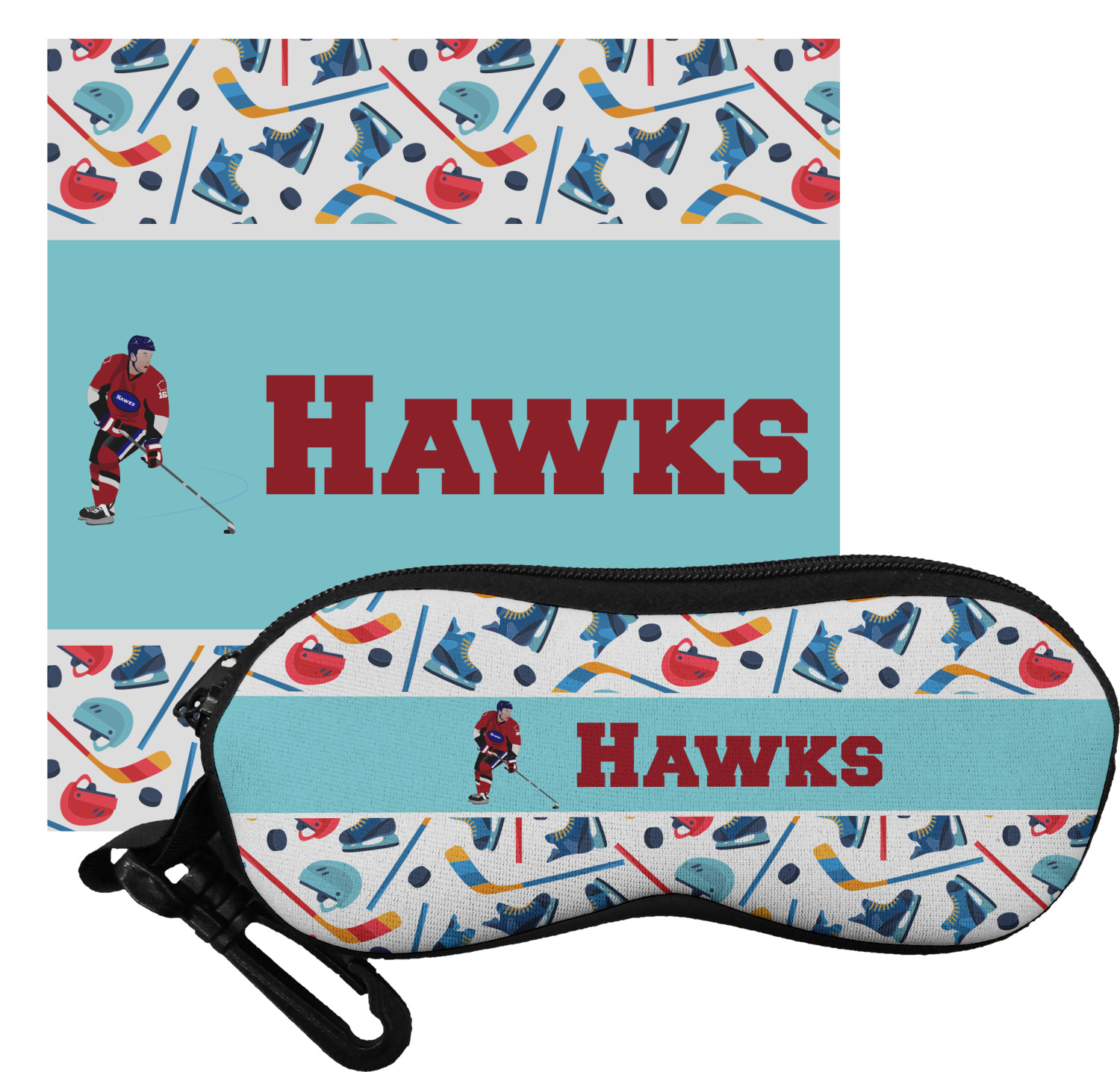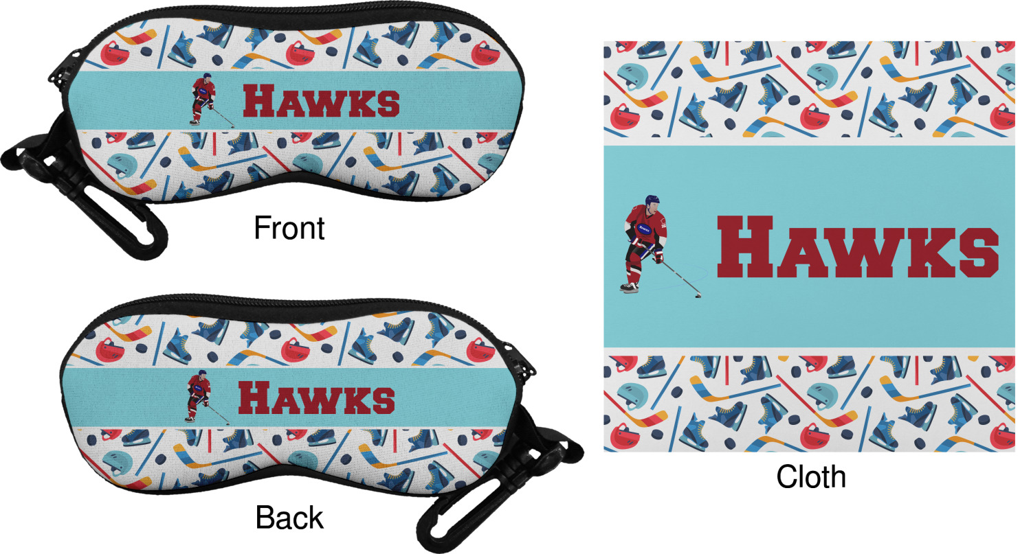 The main design has a fun background with illustrated hockey equipment including a helmet, hockey puck, skate, and hockey sticks. Going through the middle of the design is a solid strip of light teal with a graphic of a hockey player alongside a team name. The coordinating design uses this solid teal background with a hockey stick graphic and personalization.
