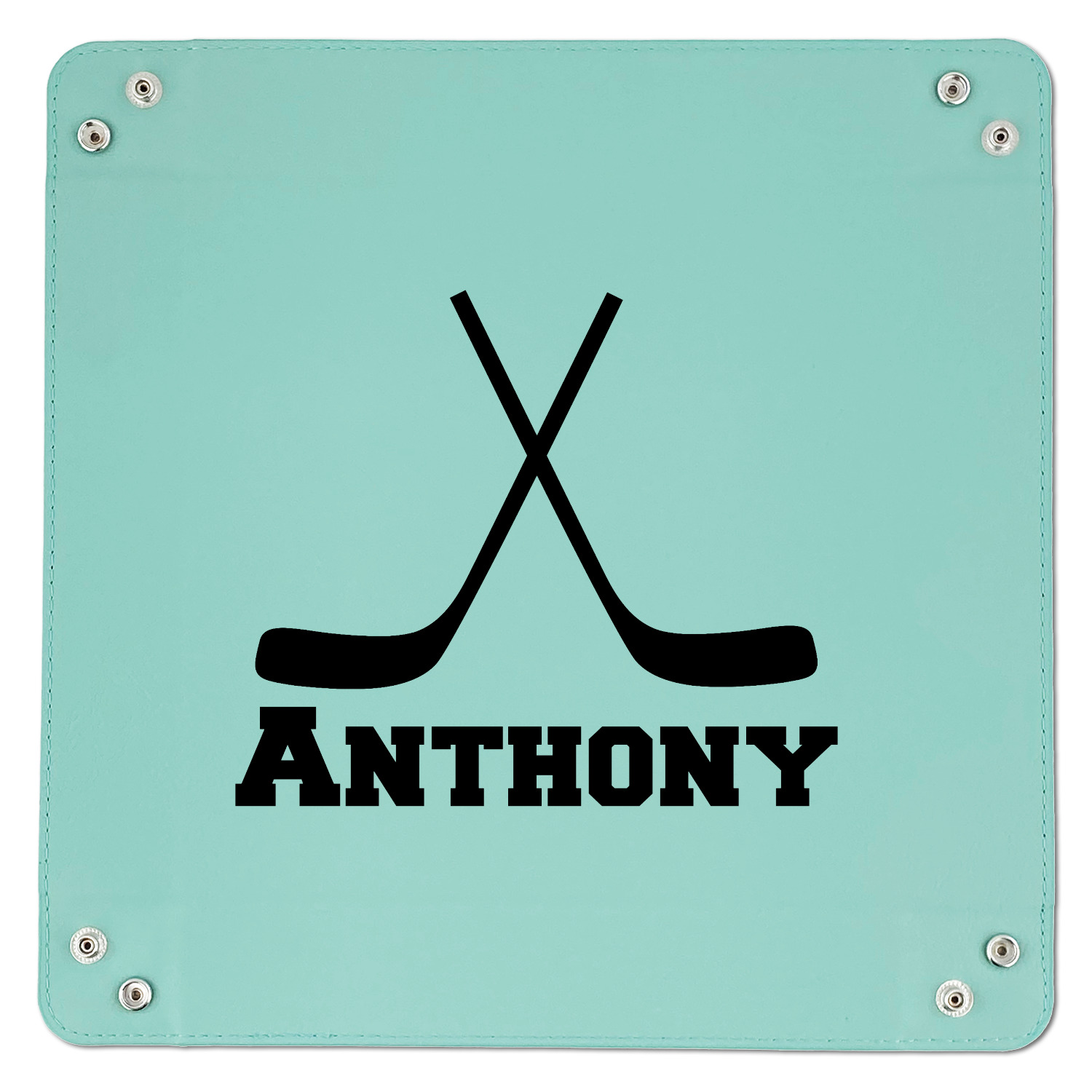 The main design has a fun background with illustrated hockey equipment including a helmet, hockey puck, skate, and hockey sticks. Going through the middle of the design is a solid strip of light teal with a graphic of a hockey player alongside a team name. The coordinating design uses this solid teal background with a hockey stick graphic and personalization.