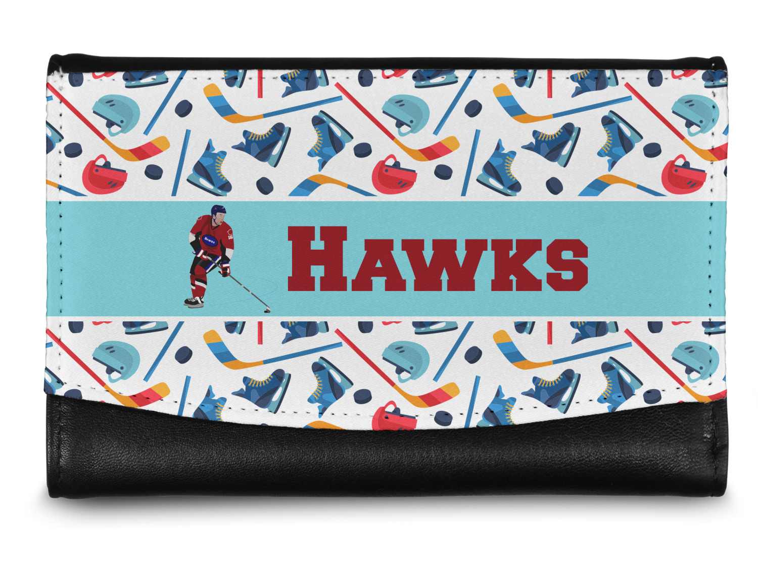 The main design has a fun background with illustrated hockey equipment including a helmet, hockey puck, skate, and hockey sticks. Going through the middle of the design is a solid strip of light teal with a graphic of a hockey player alongside a team name. The coordinating design uses this solid teal background with a hockey stick graphic and personalization.