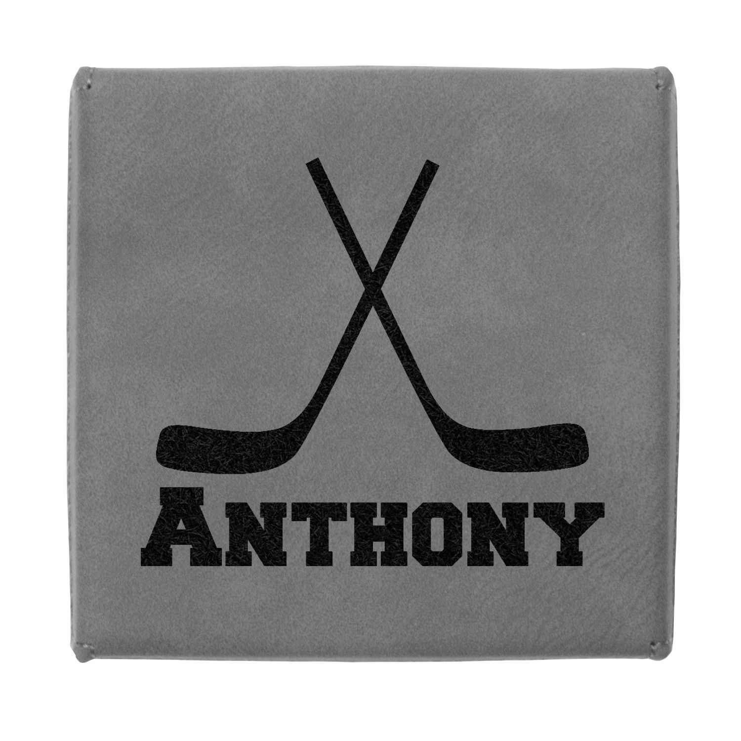 The main design has a fun background with illustrated hockey equipment including a helmet, hockey puck, skate, and hockey sticks. Going through the middle of the design is a solid strip of light teal with a graphic of a hockey player alongside a team name. The coordinating design uses this solid teal background with a hockey stick graphic and personalization.